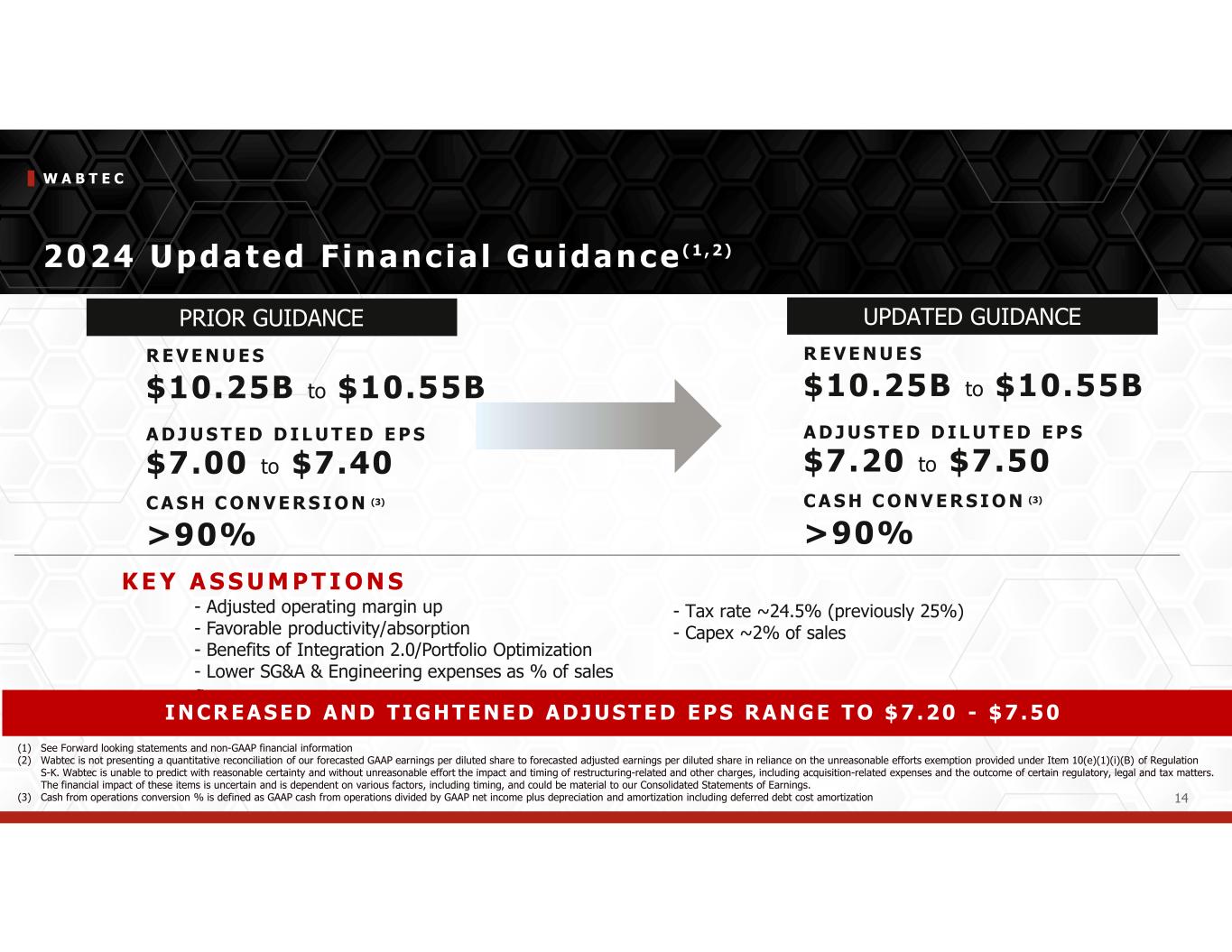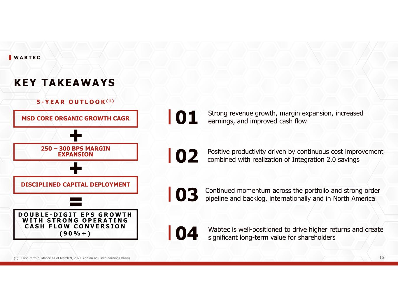 W A B T E C 14 2024 Updated F inanc ial Guidance ( 1 , 2 ) - Adjusted operating margin up - Favorable productivity/absorption - Benefits of Integration 2.0/Portfolio Optimization - Lower SG&A & Engineering expenses as % of sales g K E Y A S S U M P T I O N S - Tax rate ~24.5% (previously 25%) - Capex ~2% of sales R E V E N U E S $10.25B to $10.55B A D J U S T E D D I L U T E D E P S $7.00 to $7.40 C A S H C O N V E R S I O N (3) >90% UPDATED GUIDANCEPRIOR GUIDANCE R E V E N U E S $10.25B to $10.55B A D J U S T E D D I L U T E D E P S $7.20 to $7.50 C A S H C O N V E R S I O N (3) >90% (1) See Forward looking statements and non-GAAP financial information (2) Wabtec is not presenting a quantitative reconciliation of our forecasted GAAP earnings per diluted share to forecasted adjusted earnings per diluted share in reliance on the unreasonable efforts exemption provided under Item 10(e)(1)(i)(B) of Regulation S-K. Wabtec is unable to predict with reasonable certainty and without unreasonable effort the impact and timing of restructuring-related and other charges, including acquisition-related expenses and the outcome of certain regulatory, legal and tax matters. The financial impact of these items is uncertain and is dependent on various factors, including timing, and could be material to our Consolidated Statements of Earnings. (3) Cash from operations conversion % is defined as GAAP cash from operations divided by GAAP net income plus depreciation and amortization including deferred debt cost amortization I N CR EAS ED A ND TI GHT EN ED ADJ US T ED EPS RAN GE TO $ 7 .20 - $7 . 50