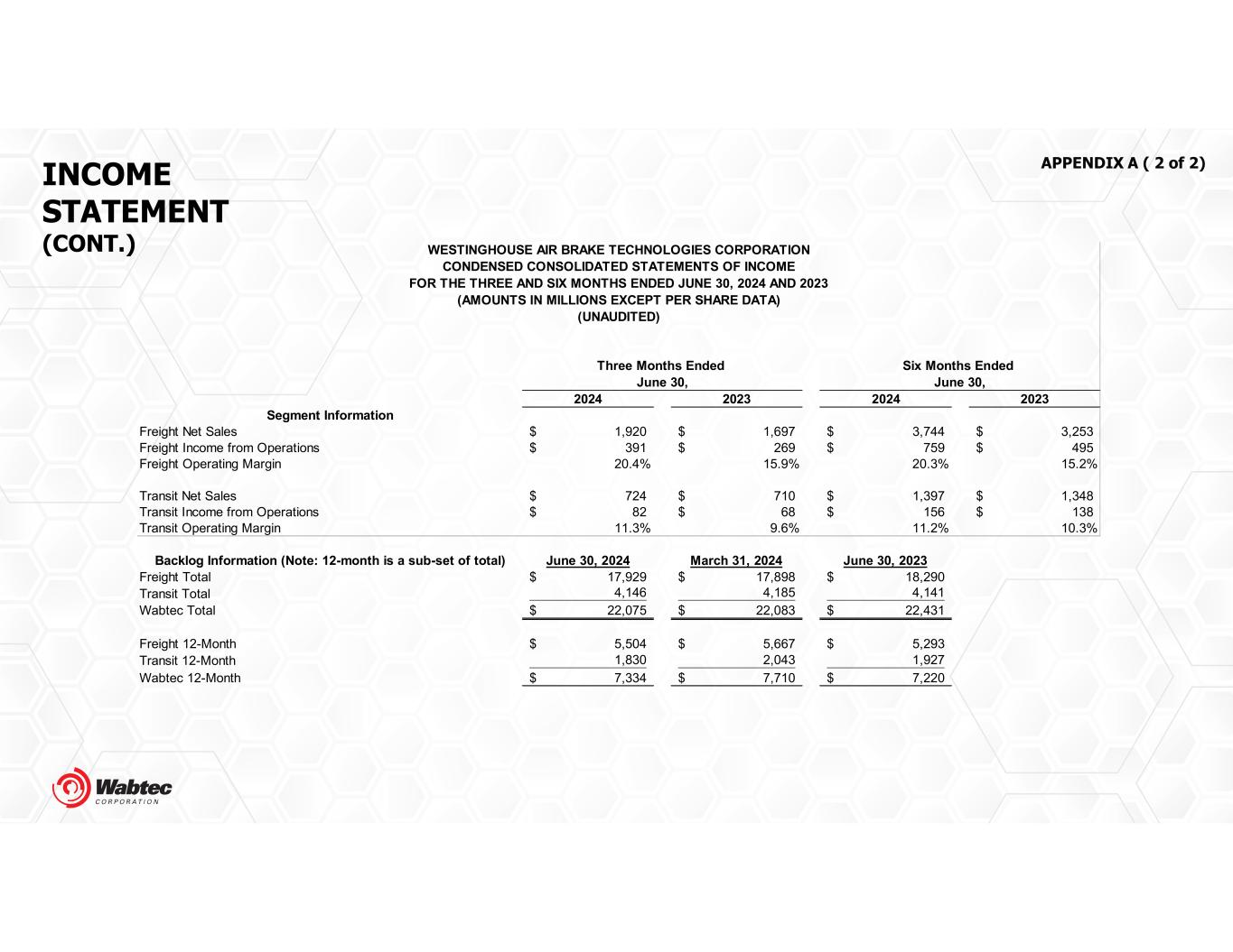 INCOME STATEMENT (CONT.) APPENDIX A ( 2 of 2) Segment Information Freight Net Sales 1,920$ 1,697$ 3,744$ 3,253$ Freight Income from Operations 391$ 269$ 759$ 495$ Freight Operating Margin 20.4% 15.9% 20.3% 15.2% Transit Net Sales 724$ 710$ 1,397$ 1,348$ Transit Income from Operations 82$ 68$ 156$ 138$ Transit Operating Margin 11.3% 9.6% 11.2% 10.3% Backlog Information (Note: 12-month is a sub-set of total) June 30, 2024 March 31, 2024 June 30, 2023 Freight Total 17,929$ 17,898$ 18,290$ Transit Total 4,146 4,185 4,141 Wabtec Total 22,075$ 22,083$ 22,431$ Freight 12-Month 5,504$ 5,667$ 5,293$ Transit 12-Month 1,830 2,043 1,927 Wabtec 12-Month 7,334$ 7,710$ 7,220$ 2024 2023 2024 2023 Three Months Ended Six Months Ended June 30, June 30, WESTINGHOUSE AIR BRAKE TECHNOLOGIES CORPORATION CONDENSED CONSOLIDATED STATEMENTS OF INCOME FOR THE THREE AND SIX MONTHS ENDED JUNE 30, 2024 AND 2023 (AMOUNTS IN MILLIONS EXCEPT PER SHARE DATA) (UNAUDITED)