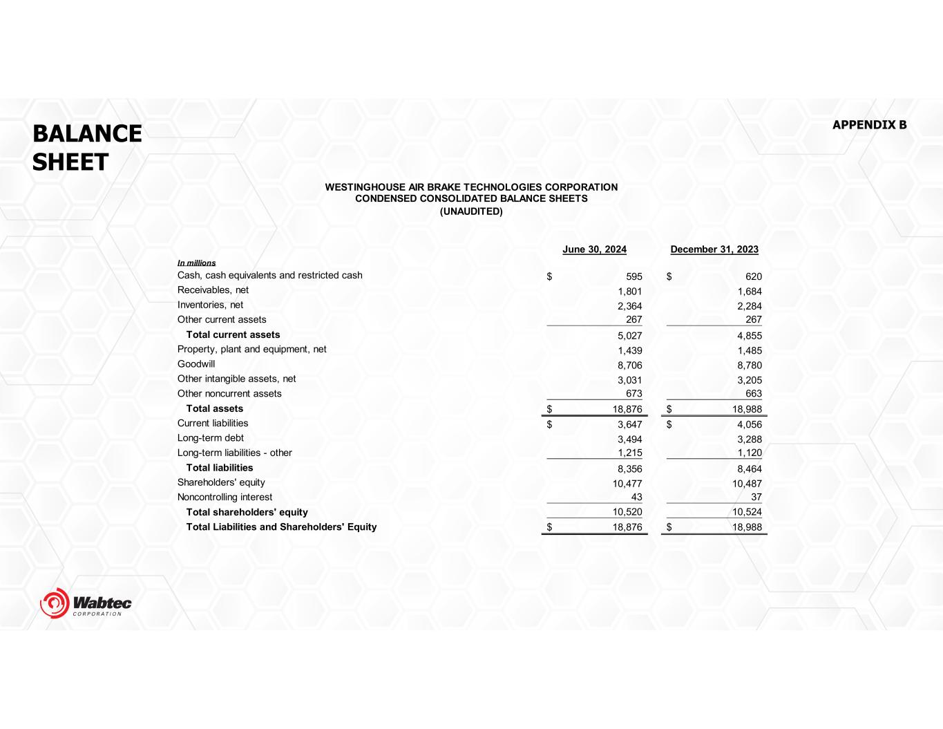 BALANCE SHEET APPENDIX B June 30, 2024 December 31, 2023 In millions Cash, cash equivalents and restricted cash 595$ 620$ Receivables, net 1,801 1,684 Inventories, net 2,364 2,284 Other current assets 267 267 Total current assets 5,027 4,855 Property, plant and equipment, net 1,439 1,485 Goodwill 8,706 8,780 Other intangible assets, net 3,031 3,205 Other noncurrent assets 673 663 Total assets 18,876$ 18,988$ Current liabilities 3,647$ 4,056$ Long-term debt 3,494 3,288 Long-term liabilities - other 1,215 1,120 Total liabilities 8,356 8,464 Shareholders' equity 10,477 10,487 Noncontrolling interest 43 37 Total shareholders' equity 10,520 10,524 Total Liabilities and Shareholders' Equity 18,876$ 18,988$ WESTINGHOUSE AIR BRAKE TECHNOLOGIES CORPORATION CONDENSED CONSOLIDATED BALANCE SHEETS (UNAUDITED)