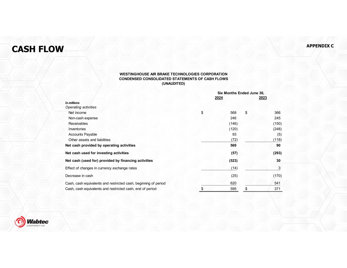 CASH FLOW APPENDIX C 2024 2023 In millions Operating activities Net income 568$ 366$ Non-cash expense 246 245 Receivables (146) (150) Inventories (120) (248) Accounts Payable 93 (5) Other assets and liabilities (72) (118) Net cash provided by operating activities 569 90 Net cash used for investing activities (57) (293) Net cash (used for) provided by financing activities (523) 30 Effect of changes in currency exchange rates (14) 3 Decrease in cash (25) (170) Cash, cash equivalents and restricted cash, beginning of period 620 541 Cash, cash equivalents and restricted cash, end of period 595$ 371$ Six Months Ended June 30, WESTINGHOUSE AIR BRAKE TECHNOLOGIES CORPORATION CONDENSED CONSOLIDATED STATEMENTS OF CASH FLOWS (UNAUDITED)