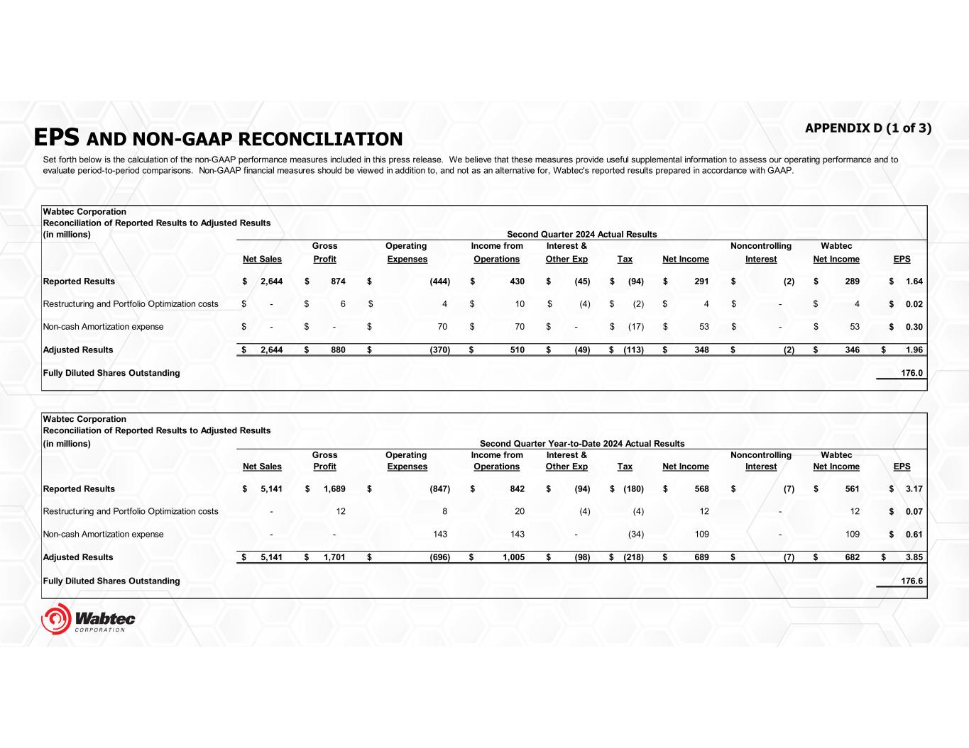 EPS AND NON-GAAP RECONCILIATION APPENDIX D (1 of 3) Wabtec Corporation Reconciliation of Reported Results to Adjusted Results (in millions) Gross Operating Income from Interest & Noncontrolling Wabtec Net Sales Profit Expenses Operations Other Exp Tax Net Income Interest Net Income EPS Reported Results 2,644$ 874$ (444)$ 430$ (45)$ (94)$ 291$ (2)$ 289$ 1.64$ Restructuring and Portfolio Optimization costs -$ 6$ 4$ 10$ (4)$ (2)$ 4$ -$ 4$ 0.02$ Non-cash Amortization expense -$ -$ 70$ 70$ -$ (17)$ 53$ -$ 53$ 0.30$ Adjusted Results 2,644$ 880$ (370)$ 510$ (49)$ (113)$ 348$ (2)$ 346$ 1.96$ Fully Diluted Shares Outstanding 176.0 Wabtec Corporation Reconciliation of Reported Results to Adjusted Results (in millions) Gross Operating Income from Interest & Noncontrolling Wabtec Net Sales Profit Expenses Operations Other Exp Tax Net Income Interest Net Income EPS Reported Results 5,141$ 1,689$ (847)$ 842$ (94)$ (180)$ 568$ (7)$ 561$ 3.17$ Restructuring and Portfolio Optimization costs - 12 8 20 (4) (4) 12 - 12 0.07$ Non-cash Amortization expense - - 143 143 - (34) 109 - 109 0.61$ Adjusted Results 5,141$ 1,701$ (696)$ 1,005$ (98)$ (218)$ 689$ (7)$ 682$ 3.85$ Fully Diluted Shares Outstanding 176.6 Second Quarter Year-to-Date 2024 Actual Results Set forth below is the calculation of the non-GAAP performance measures included in this press release. We believe that these measures provide useful supplemental information to assess our operating performance and to evaluate period-to-period comparisons. Non-GAAP financial measures should be viewed in addition to, and not as an alternative for, Wabtec's reported results prepared in accordance with GAAP. Second Quarter 2024 Actual Results