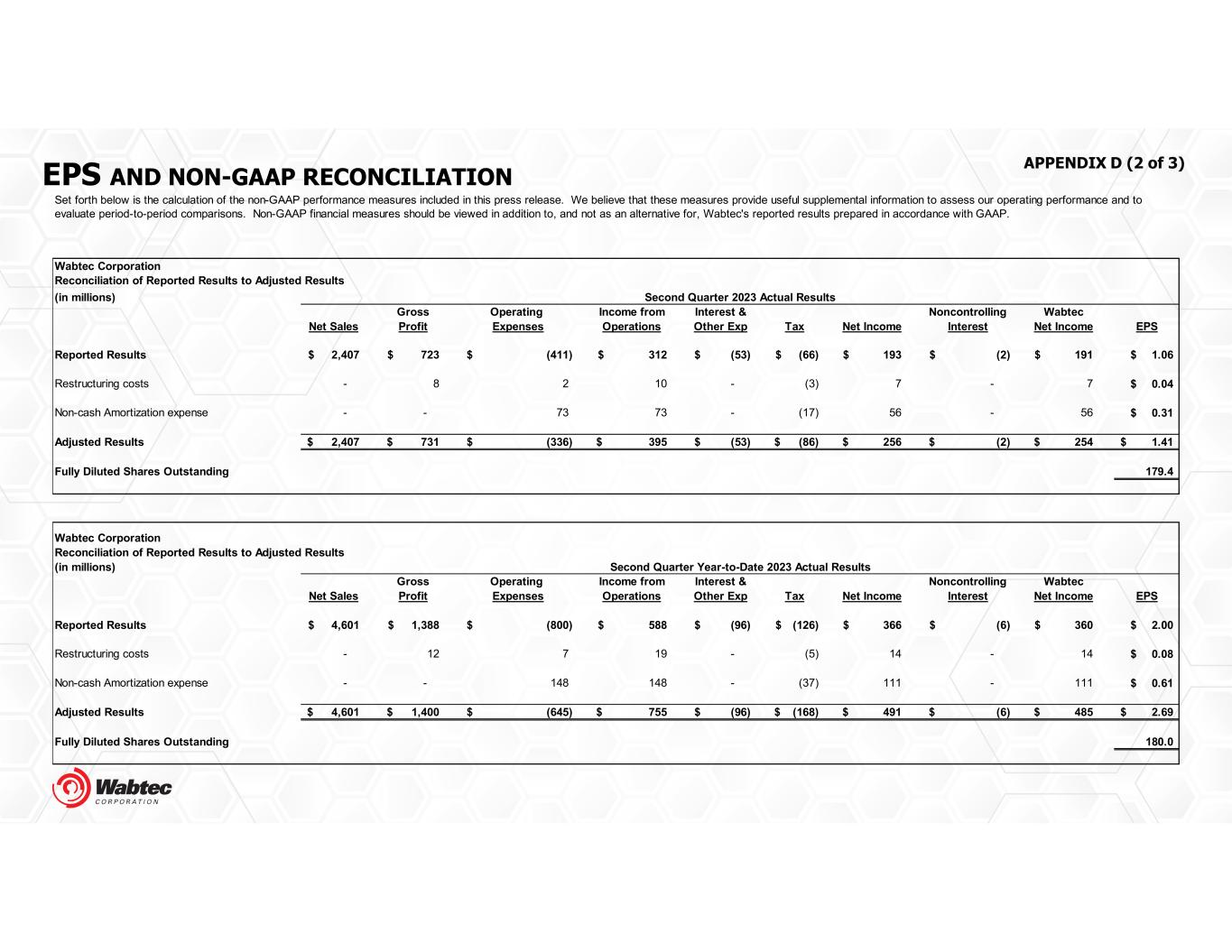 EPS AND NON-GAAP RECONCILIATION APPENDIX D (2 of 3) Wabtec Corporation Reconciliation of Reported Results to Adjusted Results (in millions) Gross Operating Income from Interest & Noncontrolling Wabtec Net Sales Profit Expenses Operations Other Exp Tax Net Income Interest Net Income EPS Reported Results 2,407$ 723$ (411)$ 312$ (53)$ (66)$ 193$ (2)$ 191$ 1.06$ Restructuring costs - 8 2 10 - (3) 7 - 7 0.04$ Non-cash Amortization expense - - 73 73 - (17) 56 - 56 0.31$ Adjusted Results 2,407$ 731$ (336)$ 395$ (53)$ (86)$ 256$ (2)$ 254$ 1.41$ Fully Diluted Shares Outstanding 179.4 Wabtec Corporation Reconciliation of Reported Results to Adjusted Results (in millions) Gross Operating Income from Interest & Noncontrolling Wabtec Net Sales Profit Expenses Operations Other Exp Tax Net Income Interest Net Income EPS Reported Results 4,601$ 1,388$ (800)$ 588$ (96)$ (126)$ 366$ (6)$ 360$ 2.00$ Restructuring costs - 12 7 19 - (5) 14 - 14 0.08$ Non-cash Amortization expense - - 148 148 - (37) 111 - 111 0.61$ Adjusted Results 4,601$ 1,400$ (645)$ 755$ (96)$ (168)$ 491$ (6)$ 485$ 2.69$ Fully Diluted Shares Outstanding 180.0 Second Quarter Year-to-Date 2023 Actual Results Set forth below is the calculation of the non-GAAP performance measures included in this press release. We believe that these measures provide useful supplemental information to assess our operating performance and to evaluate period-to-period comparisons. Non-GAAP financial measures should be viewed in addition to, and not as an alternative for, Wabtec's reported results prepared in accordance with GAAP. Second Quarter 2023 Actual Results