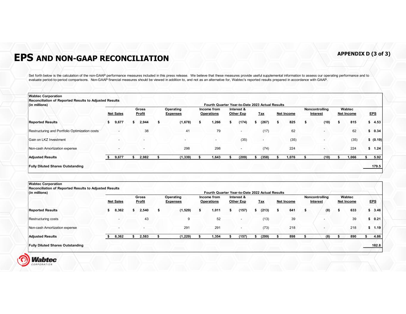 EPS AND NON-GAAP RECONCILIATION APPENDIX D (3 of 3) Wabtec Corporation Reconciliation of Reported Results to Adjusted Results (in millions) Gross Operating Income from Interest & Noncontrolling Wabtec Net Sales Profit Expenses Operations Other Exp Tax Net Income Interest Net Income EPS Reported Results 9,677$ 2,944$ (1,678)$ 1,266$ (174)$ (267)$ 825$ (10)$ 815$ 4.53$ Restructuring and Portfolio Optimization costs - 38 41 79 - (17) 62 - 62 0.34$ Gain on LKZ Investment - - - - (35) - (35) - (35) (0.19)$ Non-cash Amortization expense - - 298 298 - (74) 224 - 224 1.24$ Adjusted Results 9,677$ 2,982$ (1,339)$ 1,643$ (209)$ (358)$ 1,076$ (10)$ 1,066$ 5.92$ Fully Diluted Shares Outstanding 179.5 Wabtec Corporation Reconciliation of Reported Results to Adjusted Results (in millions) Gross Operating Income from Interest & Noncontrolling Wabtec Net Sales Profit Expenses Operations Other Exp Tax Net Income Interest Net Income EPS Reported Results 8,362$ 2,540$ (1,529)$ 1,011$ (157)$ (213)$ 641$ (8)$ 633$ 3.46$ Restructuring costs - 43 9 52 - (13) 39 - 39 0.21$ Non-cash Amortization expense - - 291 291 - (73) 218 - 218 1.19$ Adjusted Results 8,362$ 2,583$ (1,229)$ 1,354$ (157)$ (299)$ 898$ (8)$ 890$ 4.86$ Fully Diluted Shares Outstanding 182.8 Set forth below is the calculation of the non-GAAP performance measures included in this press release. We believe that these measures provide useful supplemental information to assess our operating performance and to evaluate period-to-period comparisons. Non-GAAP financial measures should be viewed in addition to, and not as an alternative for, Wabtec's reported results prepared in accordance with GAAP. Fourth Quarter Year-to-Date 2023 Actual Results Fourth Quarter Year-to-Date 2022 Actual Results