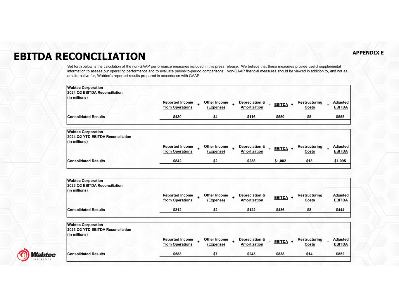 EBITDA RECONCILIATION APPENDIX E Wabtec Corporation 2024 Q2 EBITDA Reconciliation (in millions) Reported Income Other Income Depreciation & Restructuring Adjusted from Operations (Expense) Amortization Costs EBITDA Consolidated Results $430 $4 $116 $550 $5 $555 Wabtec Corporation 2024 Q2 YTD EBITDA Reconciliation (in millions) Reported Income Other Income Depreciation & Restructuring Adjusted from Operations (Expense) Amortization Costs EBITDA Consolidated Results $842 $2 $238 $1,082 $13 $1,095 Wabtec Corporation 2023 Q2 EBITDA Reconciliation (in millions) Reported Income Other Income Depreciation & Restructuring Adjusted from Operations (Expense) Amortization Costs EBITDA Consolidated Results $312 $2 $122 $436 $8 $444 Wabtec Corporation 2023 Q2 YTD EBITDA Reconciliation (in millions) Reported Income Other Income Depreciation & Restructuring Adjusted from Operations (Expense) Amortization Costs EBITDA Consolidated Results $588 $7 $243 $838 $14 $852 = + =+ = EBITDA + + + = EBITDA + + = Set forth below is the calculation of the non-GAAP performance measures included in this press release. We believe that these measures provide useful supplemental information to assess our operating performance and to evaluate period-to-period comparisons. Non-GAAP financial measures should be viewed in addition to, and not as an alternative for, Wabtec's reported results prepared in accordance with GAAP. + + = EBITDA + = EBITDA + =+