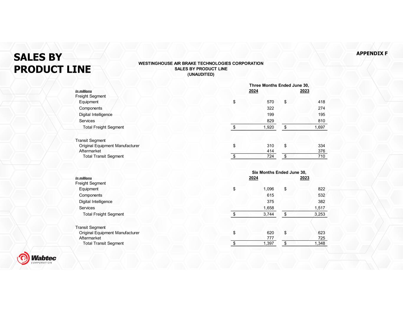SALES BY PRODUCT LINE APPENDIX F In millions 2024 2023 Freight Segment Equipment 570$ 418$ Components 322 274 Digital Intelligence 199 195 Services 829 810 Total Freight Segment 1,920$ 1,697$ Transit Segment Original Equipment Manufacturer 310$ 334$ Aftermarket 414 376 Total Transit Segment 724$ 710$ In millions 2024 2023 Freight Segment Equipment 1,096$ 822$ Components 615 532 Digital Intelligence 375 382 Services 1,658 1,517 Total Freight Segment 3,744$ 3,253$ Transit Segment Original Equipment Manufacturer 620$ 623$ Aftermarket 777 725 Total Transit Segment 1,397$ 1,348$ Six Months Ended June 30, WESTINGHOUSE AIR BRAKE TECHNOLOGIES CORPORATION SALES BY PRODUCT LINE (UNAUDITED) Three Months Ended June 30,