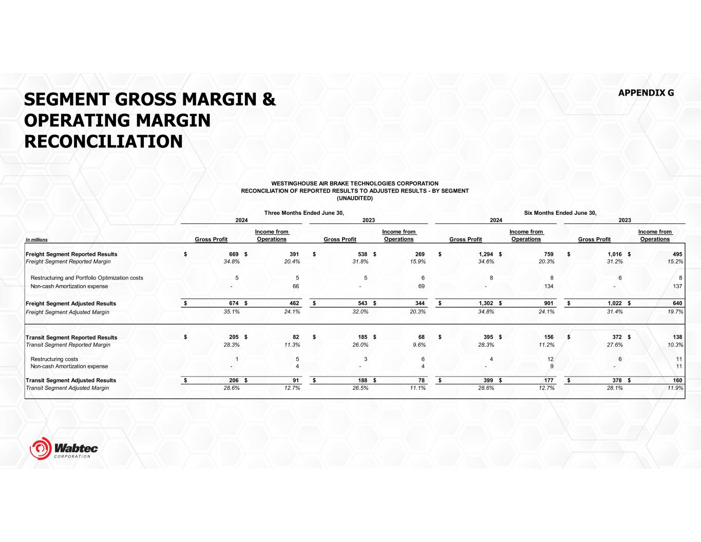 In millions Gross Profit Income from Operations Gross Profit Income from Operations Gross Profit Income from Operations Gross Profit Income from Operations Freight Segment Reported Results 669$ 391$ 538$ 269$ 1,294$ 759$ 1,016$ 495$ Freight Segment Reported Margin 34.8% 20.4% 31.8% 15.9% 34.6% 20.3% 31.2% 15.2% Restructuring and Portfolio Optimization costs 5 5 5 6 8 8 6 8 Non-cash Amortization expense - 66 - 69 - 134 - 137 Freight Segment Adjusted Results 674$ 462$ 543$ 344$ 1,302$ 901$ 1,022$ 640$ Freight Segment Adjusted Margin 35.1% 24.1% 32.0% 20.3% 34.8% 24.1% 31.4% 19.7% Transit Segment Reported Results 205$ 82$ 185$ 68$ 395$ 156$ 372$ 138$ Transit Segment Reported Margin 28.3% 11.3% 26.0% 9.6% 28.3% 11.2% 27.6% 10.3% Restructuring costs 1 5 3 6 4 12 6 11 Non-cash Amortization expense - 4 - 4 - 9 - 11 Transit Segment Adjusted Results 206$ 91$ 188$ 78$ 399$ 177$ 378$ 160$ Transit Segment Adjusted Margin 28.6% 12.7% 26.5% 11.1% 28.6% 12.7% 28.1% 11.9% WESTINGHOUSE AIR BRAKE TECHNOLOGIES CORPORATION RECONCILIATION OF REPORTED RESULTS TO ADJUSTED RESULTS - BY SEGMENT (UNAUDITED) 2024 2023 Three Months Ended June 30, Six Months Ended June 30, 2024 2023 SEGMENT GROSS MARGIN & OPERATING MARGIN RECONCILIATION APPENDIX G