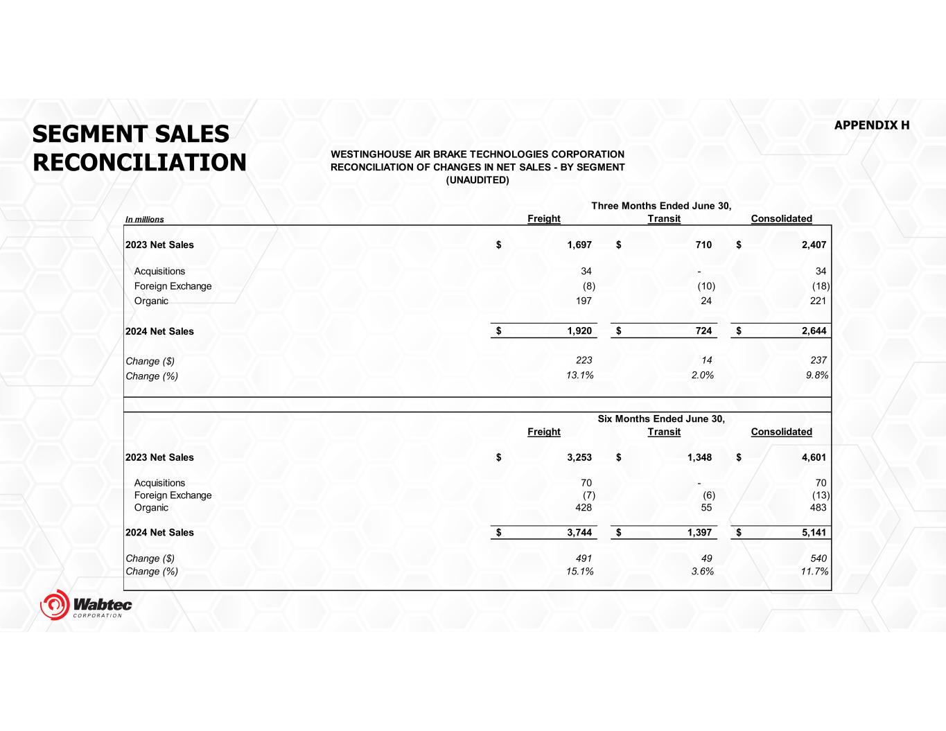 SEGMENT SALES RECONCILIATION APPENDIX H In millions Freight Transit Consolidated 2023 Net Sales 1,697$ 710$ 2,407$ Acquisitions 34 - 34 Foreign Exchange (8) (10) (18) Organic 197 24 221 2024 Net Sales 1,920$ 724$ 2,644$ Change ($) 223 14 237 Change (%) 13.1% 2.0% 9.8% Freight Transit Consolidated 2023 Net Sales 3,253$ 1,348$ 4,601$ Acquisitions 70 - 70 Foreign Exchange (7) (6) (13) Organic 428 55 483 2024 Net Sales 3,744$ 1,397$ 5,141$ Change ($) 491 49 540 Change (%) 15.1% 3.6% 11.7% (UNAUDITED) Three Months Ended June 30, Six Months Ended June 30, WESTINGHOUSE AIR BRAKE TECHNOLOGIES CORPORATION RECONCILIATION OF CHANGES IN NET SALES - BY SEGMENT