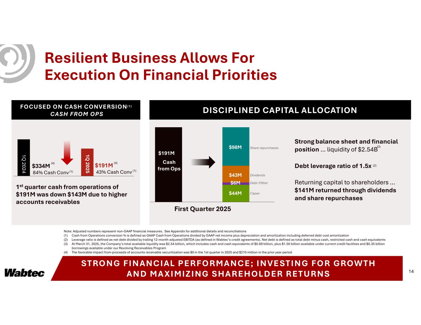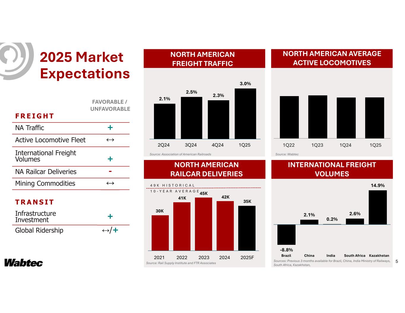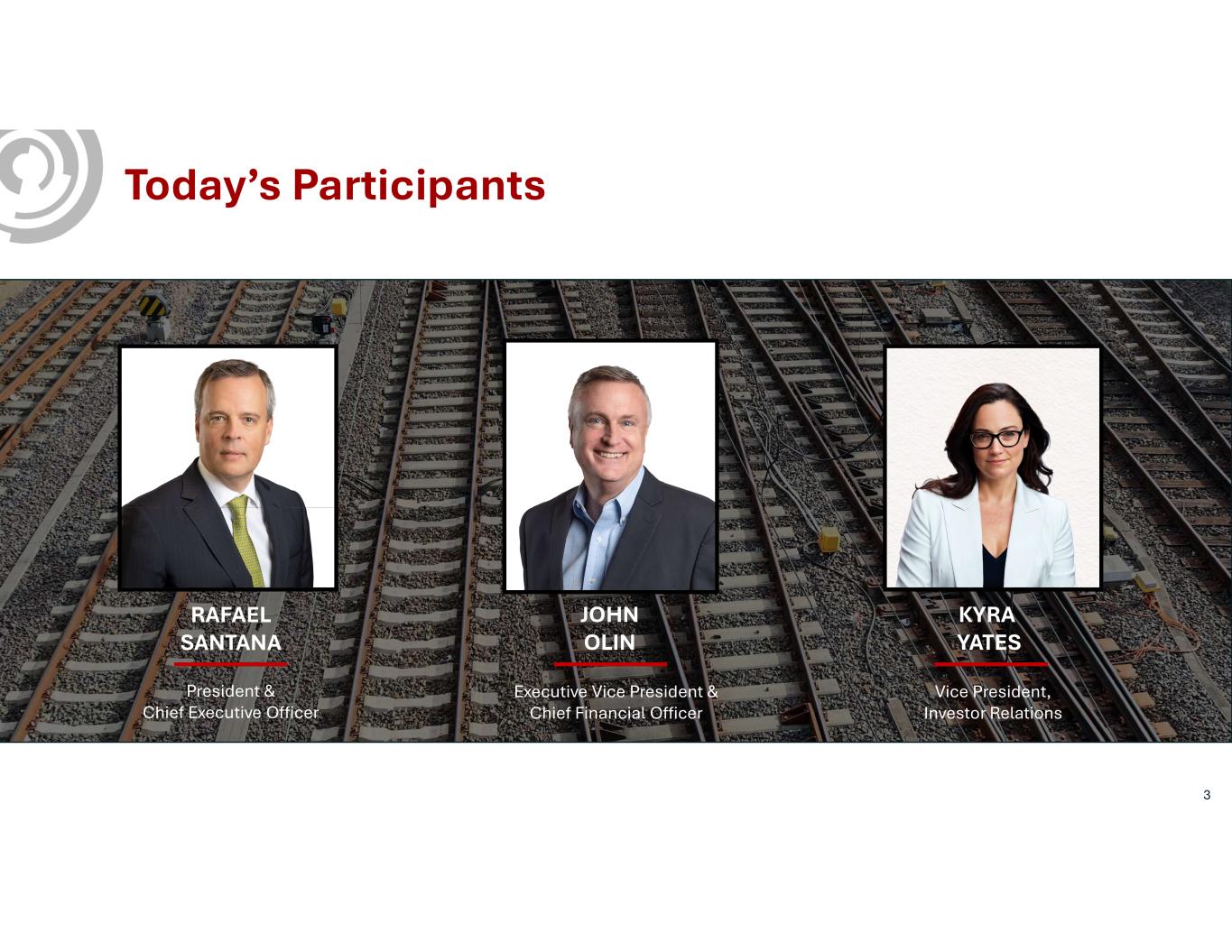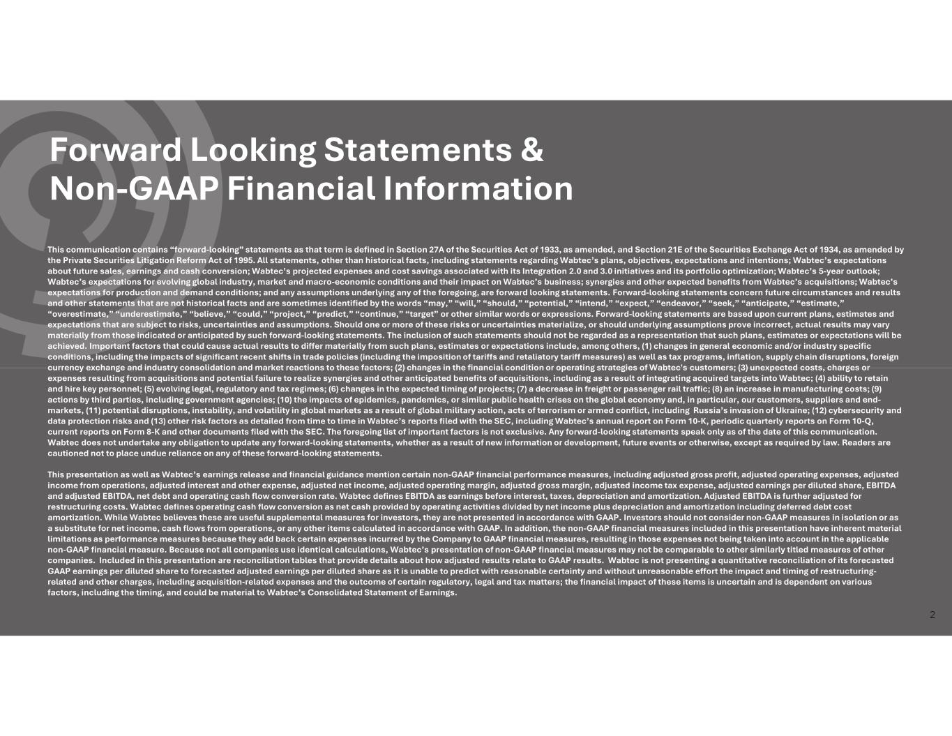 2 This communication contains “forward-looking” statements as that term is defined in Section 27A of the Securities Act of 1933, as amended, and Section 21E of the Securities Exchange Act of 1934, as amended by the Private Securities Litigation Reform Act of 1995. All statements, other than historical facts, including statements regarding Wabtec’s plans, objectives, expectations and intentions; Wabtec’s expectations about future sales, earnings and cash conversion; Wabtec’s projected expenses and cost savings associated with its Integration 2.0 and 3.0 initiatives and its portfolio optimization; Wabtec’s 5-year outlook; Wabtec’s expectations for evolving global industry, market and macro-economic conditions and their impact on Wabtec’s business; synergies and other expected benefits from Wabtec’s acquisitions; Wabtec’s expectations for production and demand conditions; and any assumptions underlying any of the foregoing, are forward looking statements. Forward-looking statements concern future circumstances and results and other statements that are not historical facts and are sometimes identified by the words “may,” “will,” “should,” “potential,” “intend,” “expect,” “endeavor,” “seek,” “anticipate,” “estimate,” “overestimate,” “underestimate,” “believe,” “could,” “project,” “predict,” “continue,” “target” or other similar words or expressions. Forward-looking statements are based upon current plans, estimates and expectations that are subject to risks, uncertainties and assumptions. Should one or more of these risks or uncertainties materialize, or should underlying assumptions prove incorrect, actual results may vary materially from those indicated or anticipated by such forward-looking statements. The inclusion of such statements should not be regarded as a representation that such plans, estimates or expectations will be achieved. Important factors that could cause actual results to differ materially from such plans, estimates or expectations include, among others, (1) changes in general economic and/or industry specific conditions, including the impacts of significant recent shifts in trade policies (including the imposition of tariffs and retaliatory tariff measures) as well as tax programs, inflation, supply chain disruptions, foreign currency exchange and industry consolidation and market reactions to these factors; (2) changes in the financial condition or operating strategies of Wabtec's customers; (3) unexpected costs, charges or expenses resulting from acquisitions and potential failure to realize synergies and other anticipated benefits of acquisitions, including as a result of integrating acquired targets into Wabtec; (4) ability to retain and hire key personnel; (5) evolving legal, regulatory and tax regimes; (6) changes in the expected timing of projects; (7) a decrease in freight or passenger rail traffic; (8) an increase in manufacturing costs; (9) actions by third parties, including government agencies; (10) the impacts of epidemics, pandemics, or similar public health crises on the global economy and, in particular, our customers, suppliers and end- markets, (11) potential disruptions, instability, and volatility in global markets as a result of global military action, acts of terrorism or armed conflict, including Russia’s invasion of Ukraine; (12) cybersecurity and data protection risks and (13) other risk factors as detailed from time to time in Wabtec’s reports filed with the SEC, including Wabtec’s annual report on Form 10-K, periodic quarterly reports on Form 10-Q, current reports on Form 8-K and other documents filed with the SEC. The foregoing list of important factors is not exclusive. Any forward-looking statements speak only as of the date of this communication. Wabtec does not undertake any obligation to update any forward-looking statements, whether as a result of new information or development, future events or otherwise, except as required by law. Readers are cautioned not to place undue reliance on any of these forward-looking statements. This presentation as well as Wabtec’s earnings release and financial guidance mention certain non-GAAP financial performance measures, including adjusted gross profit, adjusted operating expenses, adjusted income from operations, adjusted interest and other expense, adjusted net income, adjusted operating margin, adjusted gross margin, adjusted income tax expense, adjusted earnings per diluted share, EBITDA and adjusted EBITDA, net debt and operating cash flow conversion rate. Wabtec defines EBITDA as earnings before interest, taxes, depreciation and amortization. Adjusted EBITDA is further adjusted for restructuring costs. Wabtec defines operating cash flow conversion as net cash provided by operating activities divided by net income plus depreciation and amortization including deferred debt cost amortization. While Wabtec believes these are useful supplemental measures for investors, they are not presented in accordance with GAAP. Investors should not consider non-GAAP measures in isolation or as a substitute for net income, cash flows from operations, or any other items calculated in accordance with GAAP. In addition, the non-GAAP financial measures included in this presentation have inherent material limitations as performance measures because they add back certain expenses incurred by the Company to GAAP financial measures, resulting in those expenses not being taken into account in the applicable non-GAAP financial measure. Because not all companies use identical calculations, Wabtec’s presentation of non-GAAP financial measures may not be comparable to other similarly titled measures of other companies. Included in this presentation are reconciliation tables that provide details about how adjusted results relate to GAAP results. Wabtec is not presenting a quantitative reconciliation of its forecasted GAAP earni