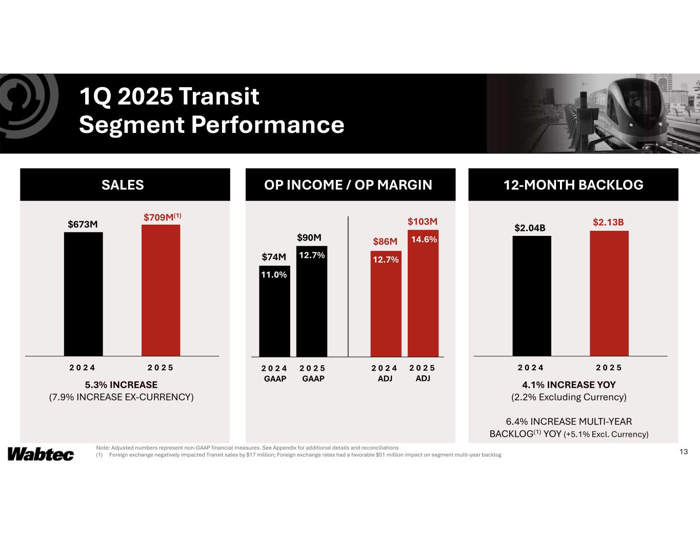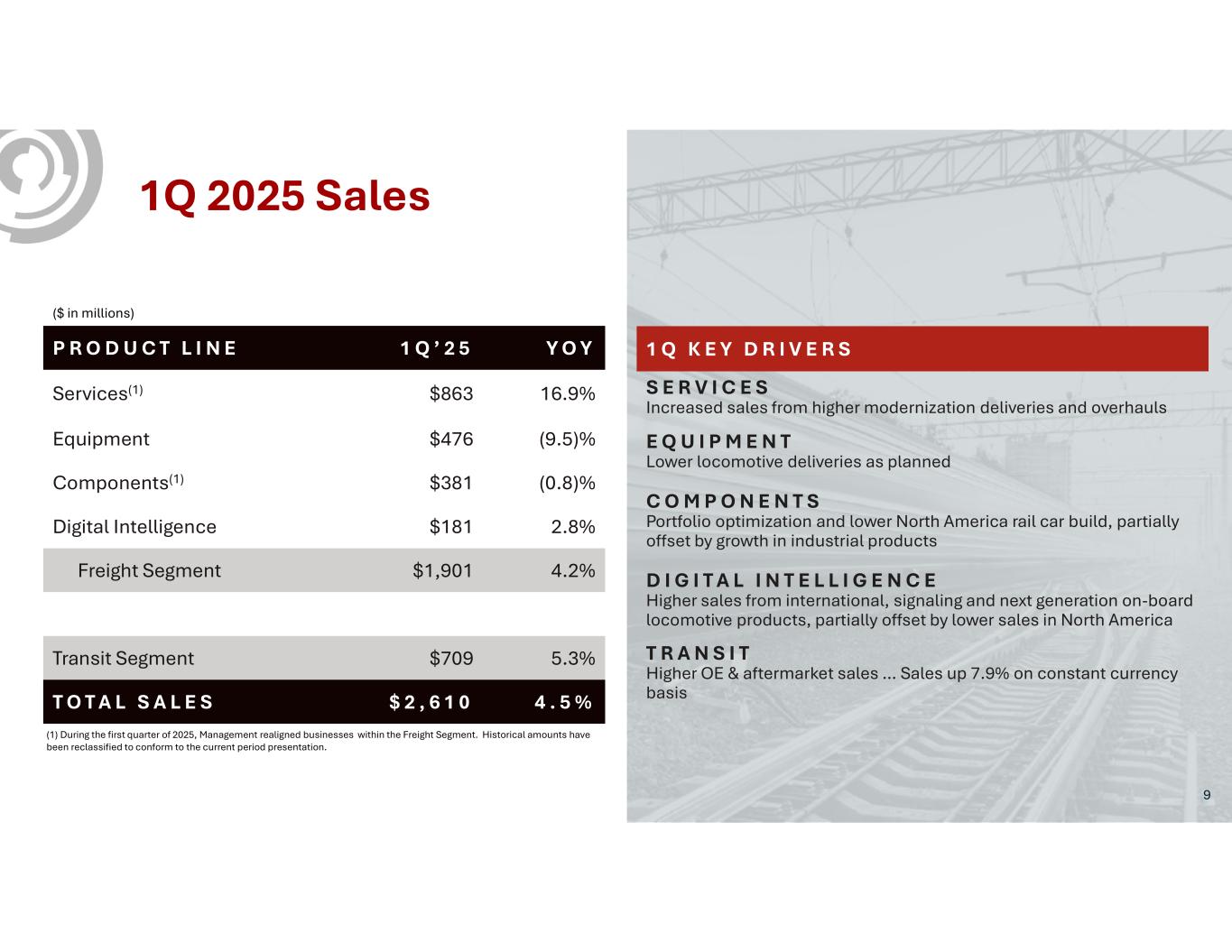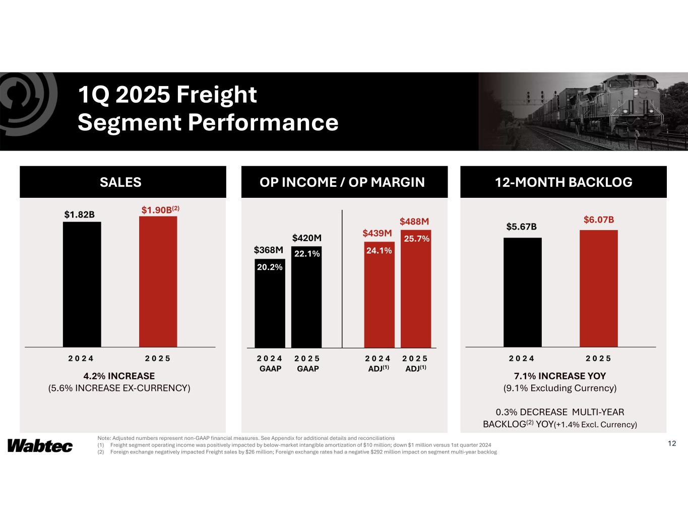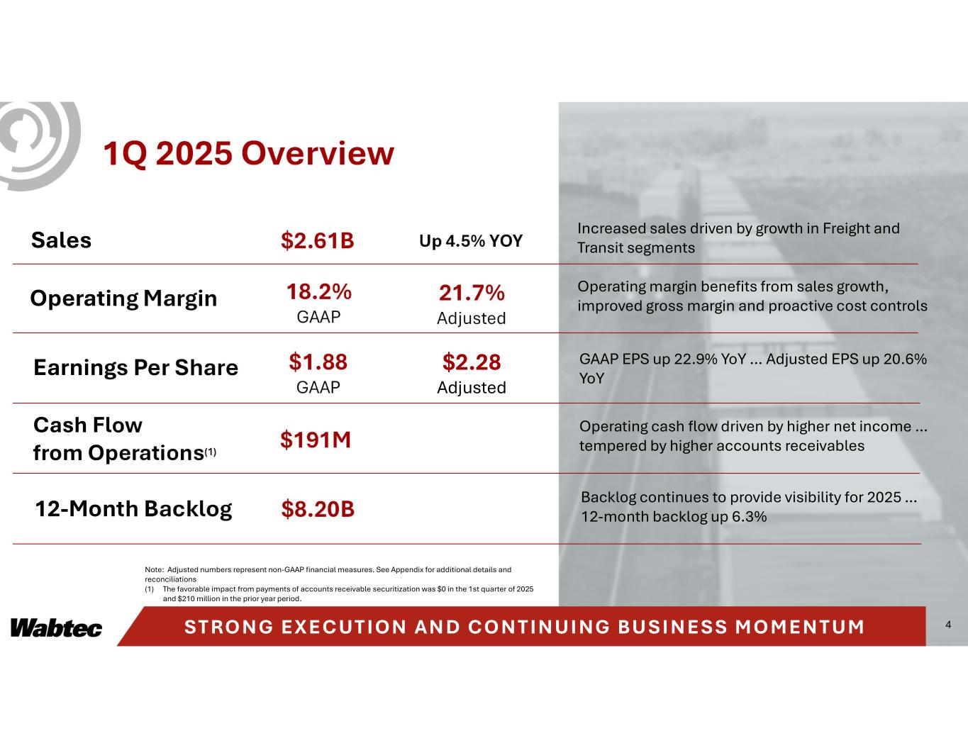 1Q 2025 Overview Up 4.5% YOY$2.61BSales 21.7% Adjusted 18.2% GAAP Operating Margin $1.88 GAAP Earnings Per Share $191M Cash Flow from Operations(1) $8.20B12-Month Backlog ST RO NG EXEC UT ION AN D CO N T INUI NG BU S I N ES S MO MEN T UM Note: Adjusted numbers represent non-GAAP financial measures. See Appendix for additional details and reconciliations (1) The favorable impact from payments of accounts receivable securitization was $0 in the 1st quarter of 2025 and $210 million in the prior year period. Increased sales driven by growth in Freight and Transit segments Operating margin benefits from sales growth, improved gross margin and proactive cost controls GAAP EPS up 22.9% YoY … Adjusted EPS up 20.6% YoY Operating cash flow driven by higher net income … tempered by higher accounts receivables Backlog continues to provide visibility for 2025 … 12-month backlog up 6.3% $2.28 Adjusted 4