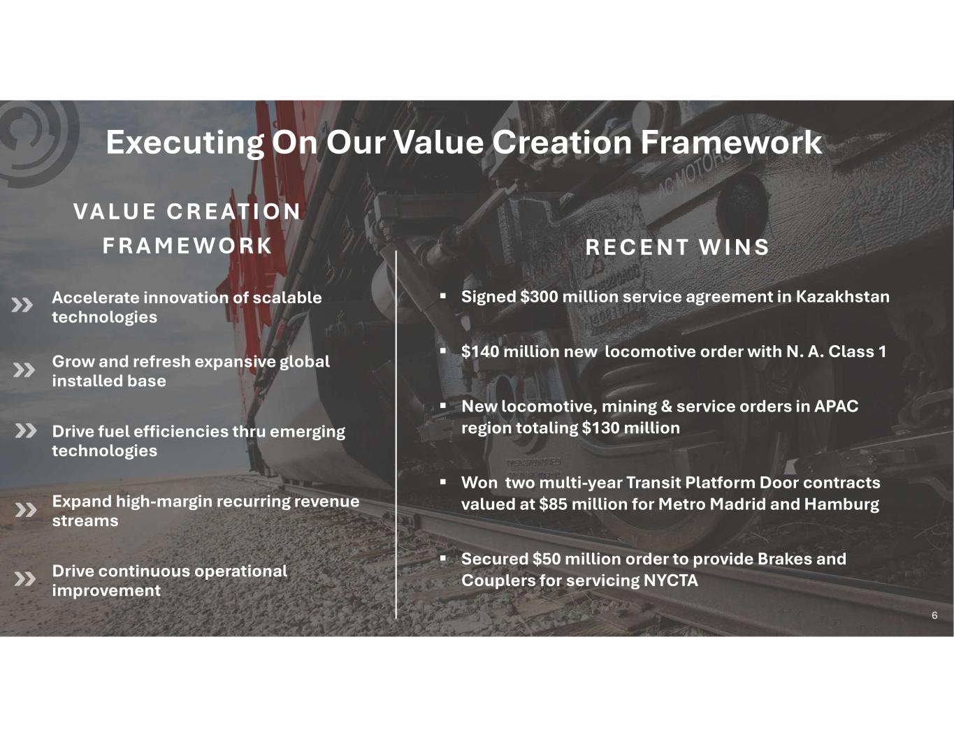 2025 Market Expectations 5 NORTH AMERICAN FREIGHT TRAFFIC F R E I G H T +NA Traffic Active Locomotive Fleet + International Freight Volumes -NA Railcar Deliveries Mining Commodities T R A N S I T +Infrastructure Investment /+Global Ridership FAVORABLE / UNFAVORABLE NORTH AMERICAN AVERAGE ACTIVE LOCOMOTIVES NORTH AMERICAN RAILCAR DELIVERIES INTERNATIONAL FREIGHT VOLUMES Sources: Previous 3 months available for Brazil, China, India Ministry of Railways, South Africa, Kazakhstan, Source: Association of American Railroads Source: Wabtec Source: Rail Supply Institute and FTR Associates 2.1% 2.5% 2.3% 3.0% 2Q24 3Q24 4Q24 1Q25 1Q22 1Q23 1Q24 1Q25 4 9 K H I S T O R I C A L 1 0 - Y E A R A V E R A G E -8.8% 2.1% 0.2% 2.6% 14.9% Brazil China India South Africa Kazakhstan2021 2022 2023 2024 2025F 30K 41K 45K 42K 35K