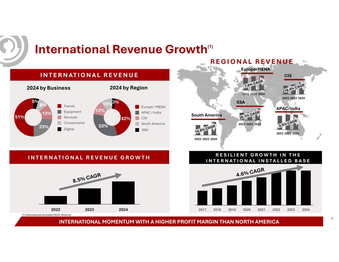 International Revenue Growth(1) INTERNATIONAL MOMENTUM WITH A HIGHER PROFIT MARGIN THAN NORTH AMERICA R E G I O N A L R E V E N U E 2022 2023 2024 Europe/MENA 2022 2023 2024 2022 2023 2024 2022 2023 2024 2022 2023 2024 South America SSA CIS APAC/India R E S I L I E N T G R O W T H I N T H E I N T E R N A T I O N A L I N S T A L L E D B A S E 2017 2018 2019 2020 2021 2022 2023 20242022 2023 2024 I N T E R N A T I O N A L R E V E N U E G R O W T H I N T E R N A T I O N A L R E V E N U E 2024 by Business 2024 by Region Digital Transit Equipment Services Components 23% 51% 13% 8% 5% 42% 33% 12% 10%3% Europe / MENA APAC / India CIS South America SSA 7 (1) International excludes North America