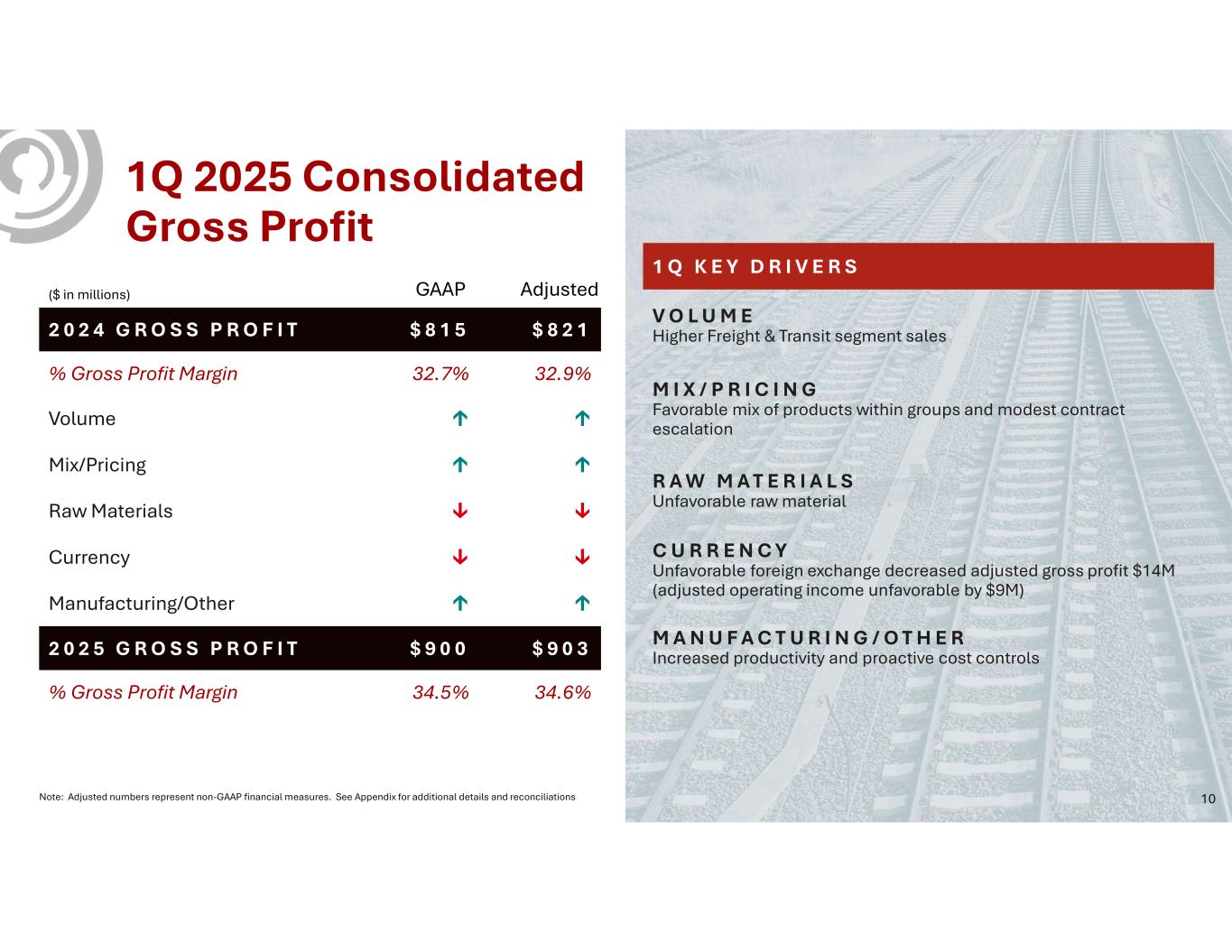 1Q 2025 Sales ($ in millions) Y O Y1 Q ’ 2 5P R O D U C T L I N E 16.9%$863Services(1) (9.5)%$476Equipment (0.8)%$381Components(1) 2.8%$181Digital Intelligence 4.2%$1,901Freight Segment 5.3%$709Transit Segment 4 . 5 %$ 2 , 6 1 0T O T A L S A L E S 1 Q K E Y D R I V E R S S E R V I C E S Increased sales from higher modernization deliveries and overhauls E Q U I P M E N T Lower locomotive deliveries as planned C O M P O N E N T S Portfolio optimization and lower North America rail car build, partially offset by growth in industrial products D I G I T A L I N T E L L I G E N C E Higher sales from international, signaling and next generation on-board locomotive products, partially offset by lower sales in North America T R A N S I T Higher OE & aftermarket sales … Sales up 7.9% on constant currency basis 9 (1) During the first quarter of 2025, Management realigned businesses within the Freight Segment. Historical amounts have been reclassified to conform to the current period presentation.