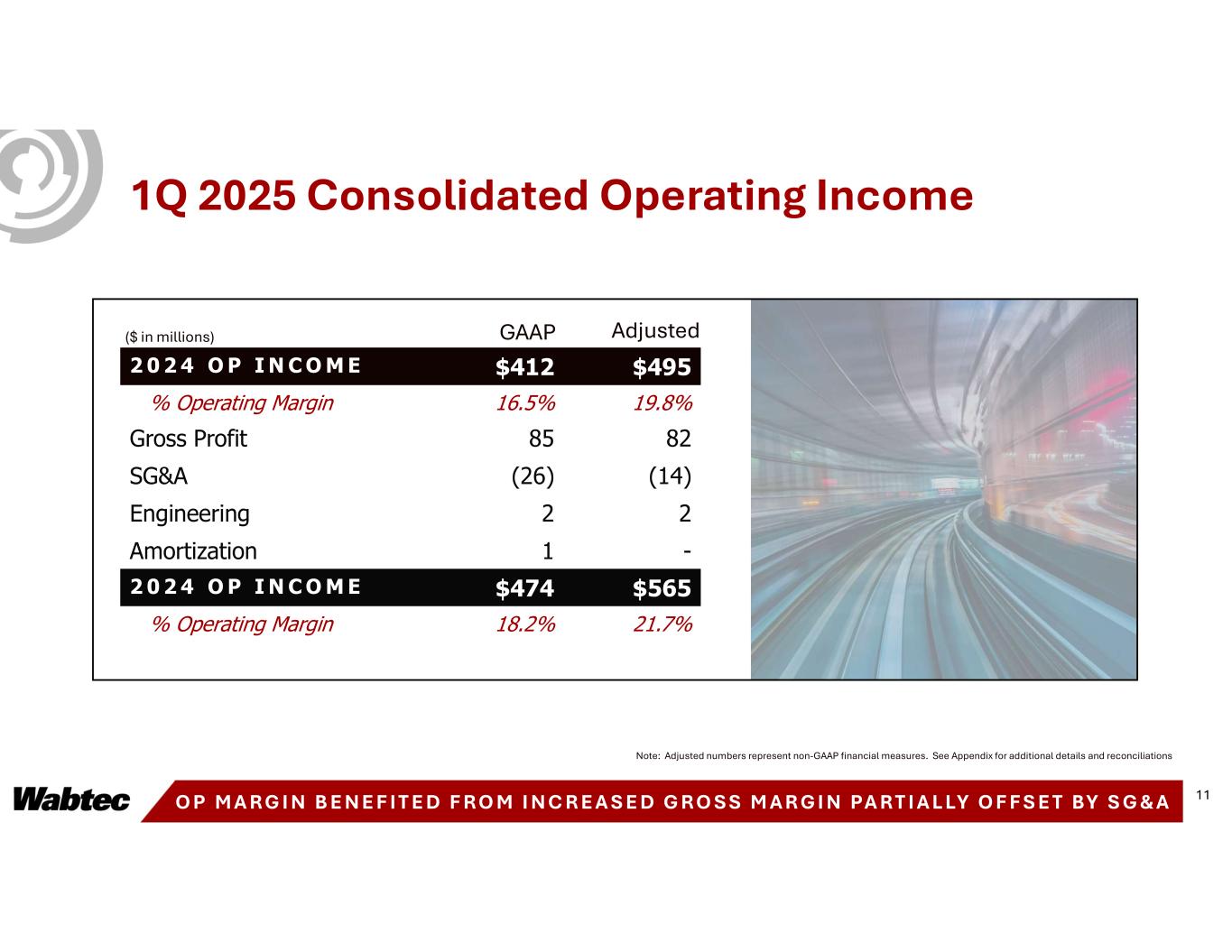 1Q 2025 Consolidated Gross Profit ($ in millions) $ 8 2 1$ 8 1 52 0 2 4 G R O S S P R O F I T 32.9%32.7%% Gross Profit Margin ↑↑Volume ↑↑Mix/Pricing ↓↓Raw Materials ↓↓Currency ↑↑Manufacturing/Other $ 9 0 3$ 9 0 02 0 2 5 G R O S S P R O F I T 34.6%34.5%% Gross Profit Margin GAAP Adjusted Note: Adjusted numbers represent non-GAAP financial measures. See Appendix for additional details and reconciliations 1 Q K E Y D R I V E R S V O L U M E Higher Freight & Transit segment sales M I X / P R I C I N G Favorable mix of products within groups and modest contract escalation R A W M A T E R I A L S Unfavorable raw material C U R R E N C Y Unfavorable foreign exchange decreased adjusted gross profit $14M (adjusted operating income unfavorable by $9M) M A N U F A C T U R I N G / O T H E R Increased productivity and proactive cost controls 10