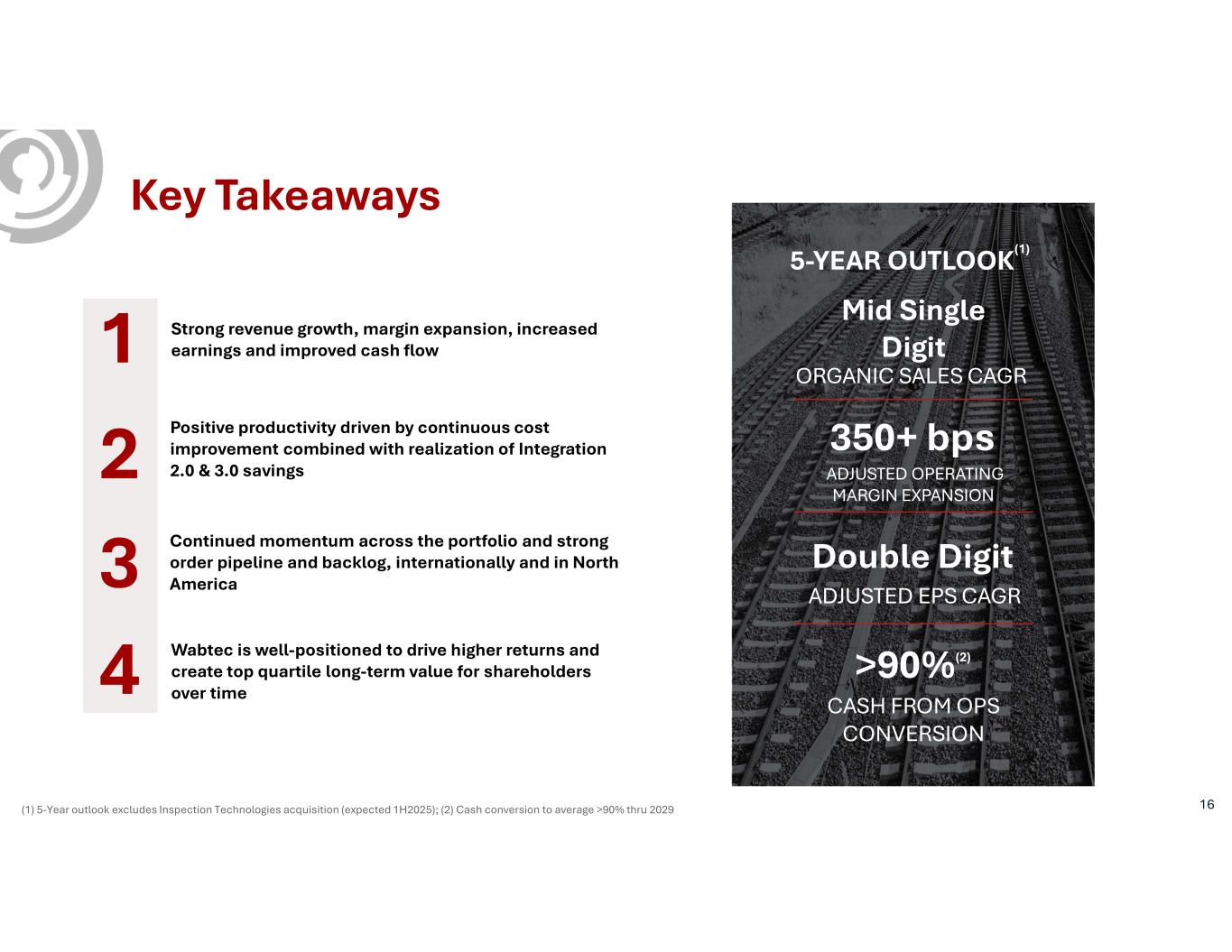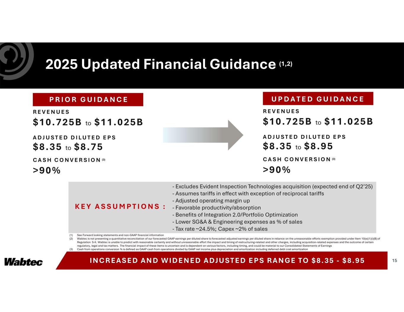 15 2025 Updated Financial Guidance (1,2) I N C R E A S E D A N D W I D E N E D A DJ U ST E D E P S R A N G E TO $ 8 . 3 5 - $ 8 . 9 5 (1) See Forward looking statements and non-GAAP financial information (2) Wabtec is not presenting a quantitative reconciliation of our forecasted GAAP earnings per diluted share to forecasted adjusted earnings per diluted share in reliance on the unreasonable efforts exemption provided under Item 10(e)(1)(i)(B) of Regulation S-K. Wabtec is unable to predict with reasonable certainty and without unreasonable effort the impact and timing of restructuring-related and other charges, including acquisition-related expenses and the outcome of certain regulatory, legal and tax matters. The financial impact of these items is uncertain and is dependent on various factors, including timing, and could be material to our Consolidated Statements of Earnings (3) Cash from operations conversion % is defined as GAAP cash from operations divided by GAAP net income plus depreciation and amortization including deferred debt cost amortization - Excludes Evident Inspection Technologies acquisition (expected end of Q2’25) - Assumes tariffs in effect with exception of reciprocal tariffs - Adjusted operating margin up - Favorable productivity/absorption - Benefits of Integration 2.0/Portfolio Optimization - Lower SG&A & Engineering expenses as % of sales - Tax rate ~24.5%; Capex ~2% of sales K E Y A S S U M P T I O N S : R E V E N U E S $10.725B to $11.0 25B A D J U S T E D D I L U T E D E P S $8.3 5 to $8.75 C A S H C O N V E R S I O N (3) >90% U P D A T E D G U I D A N C EP R I O R G U I D A N C E R E V E N U E S $10.7 25B to $11.0 25B A D J U S T E D D I L U T E D E P S $8.35 to $8.9 5 C A S H C O N V E R S I O N (3) >90%