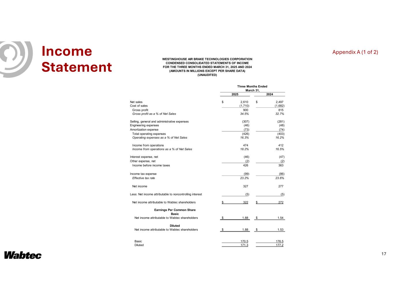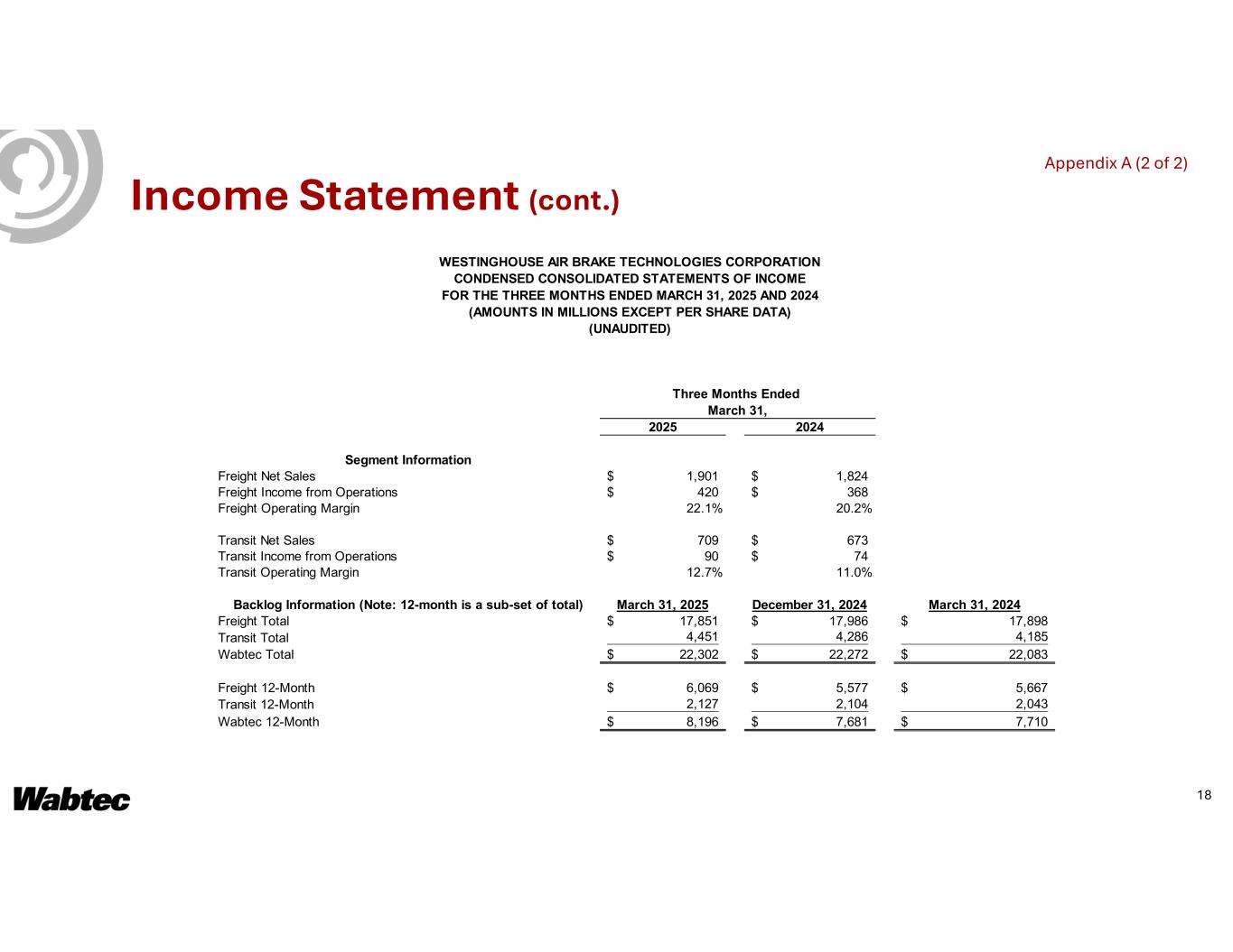 Income Statement 17 Appendix A (1 of 2) 2025 2024 Net sales 2,610$ 2,497$ Cost of sales (1,710) (1,682) Gross profit 900 815 Gross profit as a % of Net Sales 34.5% 32.7% Selling, general and administrative expenses (307) (281) Engineering expenses (46) (48) Amortization expense (73) (74) Total operating expenses (426) (403) Operating expenses as a % of Net Sales 16.3% 16.2% Income from operations 474 412 Income from operations as a % of Net Sales 18.2% 16.5% Interest expense, net (46) (47) Other expense, net (2) (2) Income before income taxes 426 363 Income tax expense (99) (86) Effective tax rate 23.2% 23.6% Net income 327 277 Less: Net income attributable to noncontrolling interest (5) (5) Net income attributable to Wabtec shareholders 322$ 272$ Earnings Per Common Share Basic Net income attributable to Wabtec shareholders 1.88$ 1.54$ Diluted Net income attributable to Wabtec shareholders 1.88$ 1.53$ Basic 170.5 176.5 Diluted 171.3 177.2 March 31, Three Months Ended WESTINGHOUSE AIR BRAKE TECHNOLOGIES CORPORATION CONDENSED CONSOLIDATED STATEMENTS OF INCOME FOR THE THREE MONTHS ENDED MARCH 31, 2025 AND 2024 (AMOUNTS IN MILLIONS EXCEPT PER SHARE DATA) (UNAUDITED)