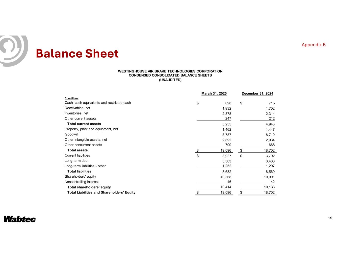 Income Statement (cont.) 18 Appendix A (2 of 2) WESTINGHOUSE AIR BRAKE TECHNOLOGIES CORPORATION CONDENSED CONSOLIDATED STATEMENTS OF INCOME FOR THE THREE MONTHS ENDED MARCH 31, 2025 AND 2024 (AMOUNTS IN MILLIONS EXCEPT PER SHARE DATA) (UNAUDITED) 2025 2024 Segment Information Freight Net Sales 1,901$ 1,824$ Freight Income from Operations 420$ 368$ Freight Operating Margin 22.1% 20.2% Transit Net Sales 709$ 673$ Transit Income from Operations 90$ 74$ Transit Operating Margin 12.7% 11.0% Backlog Information (Note: 12-month is a sub-set of total) March 31, 2025 December 31, 2024 March 31, 2024 Freight Total 17,851$ 17,986$ 17,898$ Transit Total 4,451 4,286 4,185 Wabtec Total 22,302$ 22,272$ 22,083$ Freight 12-Month 6,069$ 5,577$ 5,667$ Transit 12-Month 2,127 2,104 2,043 Wabtec 12-Month 8,196$ 7,681$ 7,710$ March 31, Three Months Ended