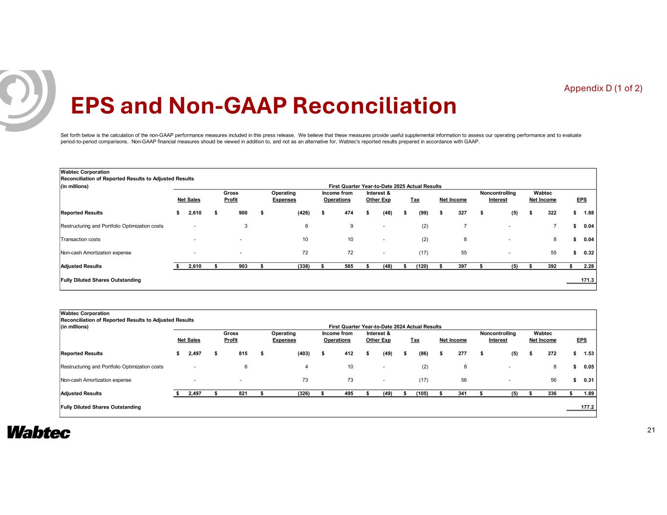 Cash Flow 20 Appendix C 2025 2024 In millions Operating activities Net income 327$ 277$ Non-cash expense 127 126 Receivables (226) 121 Inventories (29) (85) Accounts Payable 13 45 Other assets and liabilities (21) (150) Net cash provided by operating activities 191 334 Net cash used for investing activities (44) (19) Net cash used for financing activities (172) (289) Effect of changes in currency exchange rates 8 (7) (Decrease) increase in cash (17) 19 Cash, cash equivalents and restricted cash, beginning of period 715 620 Cash, cash equivalents and restricted cash, end of period 698$ 639$ WESTINGHOUSE AIR BRAKE TECHNOLOGIES CORPORATION CONDENSED CONSOLIDATED STATEMENTS OF CASH FLOWS (UNAUDITED) Three Months Ended March 31,