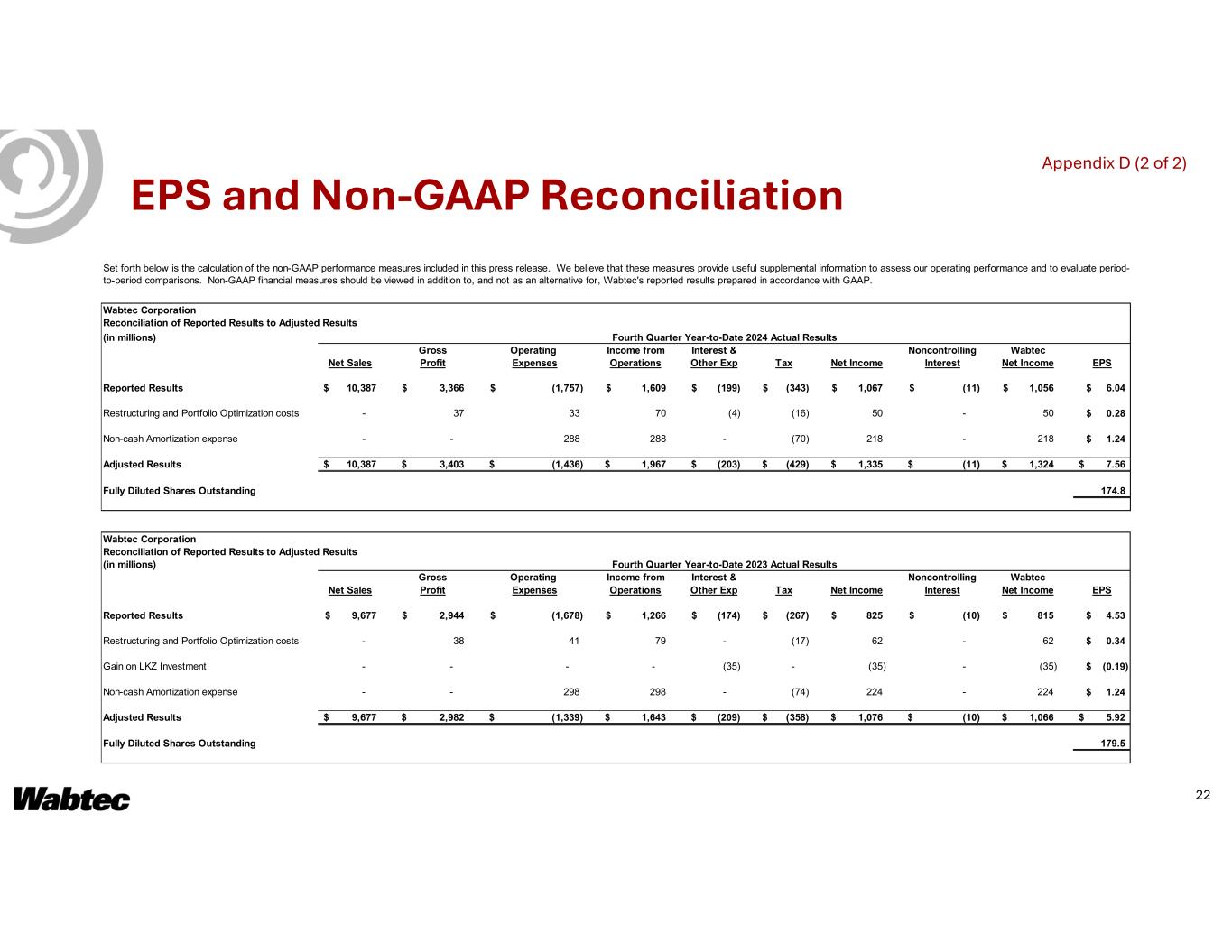 EPS and Non-GAAP Reconciliation 21 Appendix D (1 of 2) Wabtec Corporation Reconciliation of Reported Results to Adjusted Results (in millions) Gross Operating Income from Interest & Noncontrolling Wabtec Net Sales Profit Expenses Operations Other Exp Tax Net Income Interest Net Income EPS Reported Results 2,610$ 900$ (426)$ 474$ (48)$ (99)$ 327$ (5)$ 322$ 1.88$ Restructuring and Portfolio Optimization costs - 3 6 9 - (2) 7 - 7 0.04$ Transaction costs - - 10 10 - (2) 8 - 8 0.04$ Non-cash Amortization expense - - 72 72 - (17) 55 - 55 0.32$ Adjusted Results 2,610$ 903$ (338)$ 565$ (48)$ (120)$ 397$ (5)$ 392$ 2.28$ Fully Diluted Shares Outstanding 171.3 Wabtec Corporation Reconciliation of Reported Results to Adjusted Results (in millions) Gross Operating Income from Interest & Noncontrolling Wabtec Net Sales Profit Expenses Operations Other Exp Tax Net Income Interest Net Income EPS Reported Results 2,497$ 815$ (403)$ 412$ (49)$ (86)$ 277$ (5)$ 272$ 1.53$ Restructuring and Portfolio Optimization costs - 6 4 10 - (2) 8 - 8 0.05$ Non-cash Amortization expense - - 73 73 - (17) 56 - 56 0.31$ Adjusted Results 2,497$ 821$ (326)$ 495$ (49)$ (105)$ 341$ (5)$ 336$ 1.89$ Fully Diluted Shares Outstanding 177.2 First Quarter Year-to-Date 2024 Actual Results Set forth below is the calculation of the non-GAAP performance measures included in this press release. We believe that these measures provide useful supplemental information to assess our operating performance and to evaluate period-to-period comparisons. Non-GAAP financial measures should be viewed in addition to, and not as an alternative for, Wabtec's reported results prepared in accordance with GAAP. First Quarter Year-to-Date 2025 Actual Results