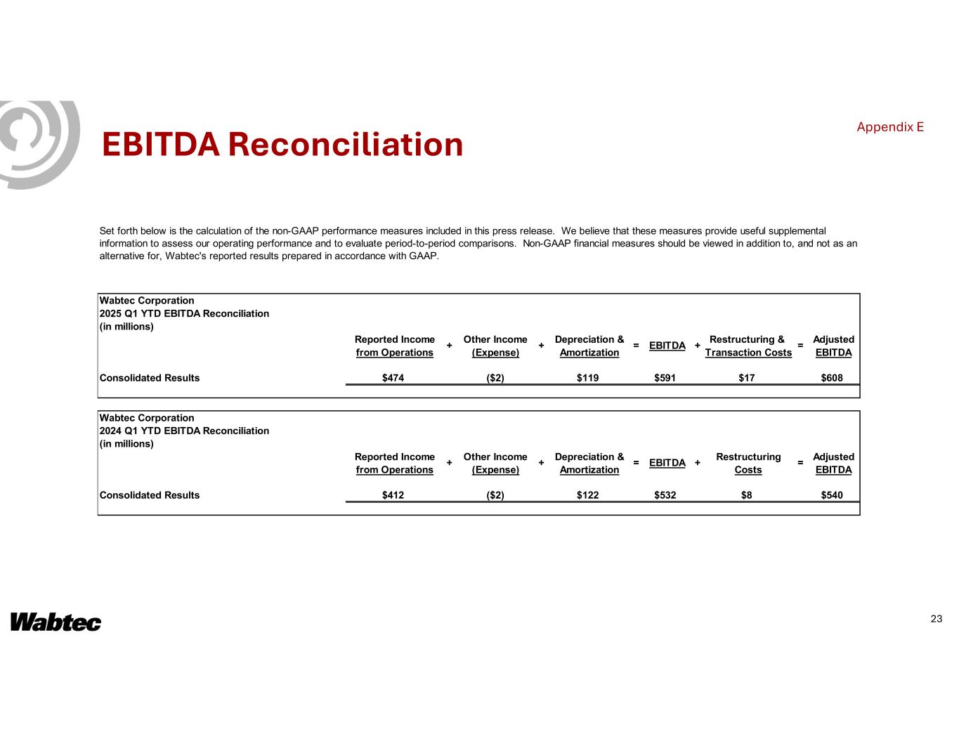 EBITDA Reconciliation 23 Appendix E Wabtec Corporation 2025 Q1 YTD EBITDA Reconciliation (in millions) Reported Income Other Income Depreciation & Restructuring & Adjusted from Operations (Expense) Amortization Transaction Costs EBITDA Consolidated Results $474 ($2) $119 $591 $17 $608 Wabtec Corporation 2024 Q1 YTD EBITDA Reconciliation (in millions) Reported Income Other Income Depreciation & Restructuring Adjusted from Operations (Expense) Amortization Costs EBITDA Consolidated Results $412 ($2) $122 $532 $8 $540 Set forth below is the calculation of the non-GAAP performance measures included in this press release. We believe that these measures provide useful supplemental information to assess our operating performance and to evaluate period-to-period comparisons. Non-GAAP financial measures should be viewed in addition to, and not as an alternative for, Wabtec's reported results prepared in accordance with GAAP. + + = EBITDA + = =+ + = EBITDA +