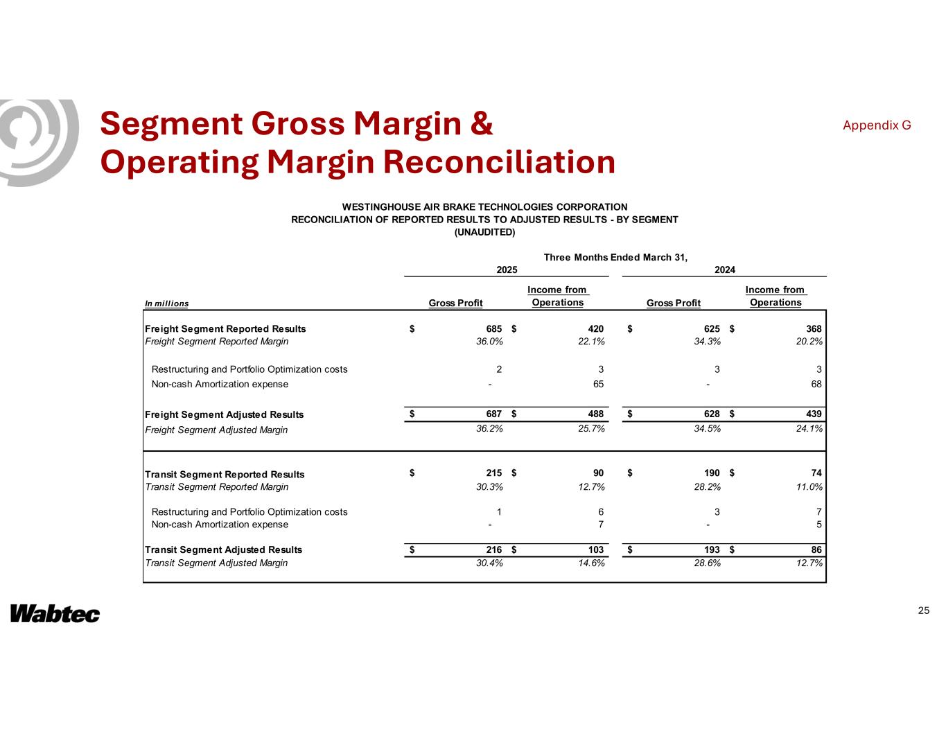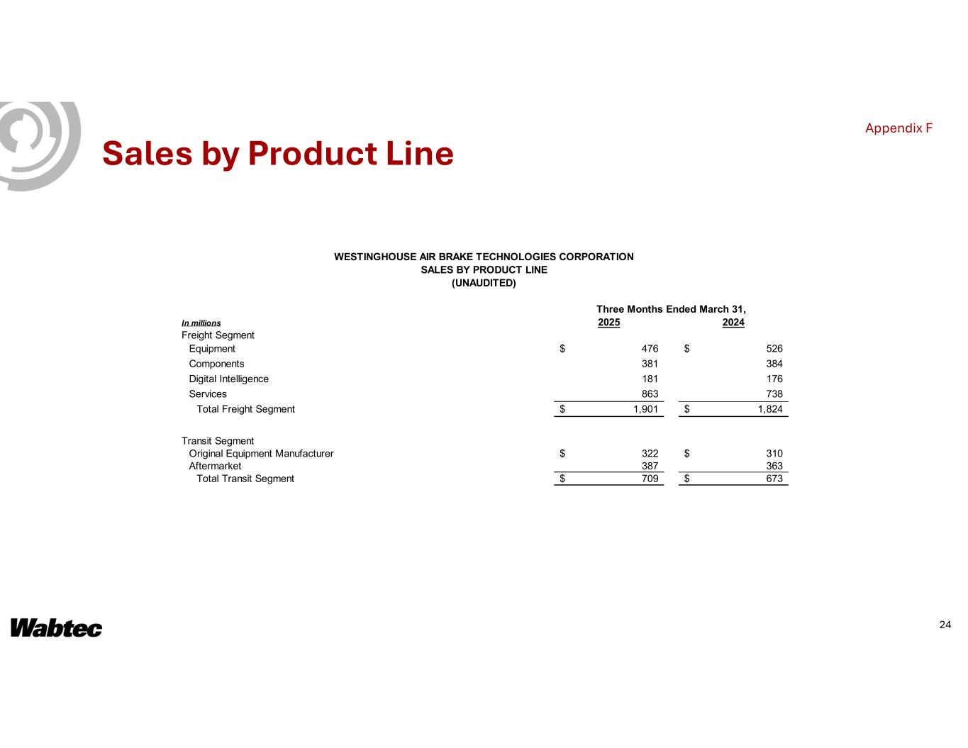 Sales by Product Line 24 Appendix F In millions 2025 2024 Freight Segment Equipment 476$ 526$ Components 381 384 Digital Intelligence 181 176 Services 863 738 Total Freight Segment 1,901$ 1,824$ Transit Segment Original Equipment Manufacturer 322$ 310$ Aftermarket 387 363 Total Transit Segment 709$ 673$ Three Months Ended March 31, WESTINGHOUSE AIR BRAKE TECHNOLOGIES CORPORATION SALES BY PRODUCT LINE (UNAUDITED)