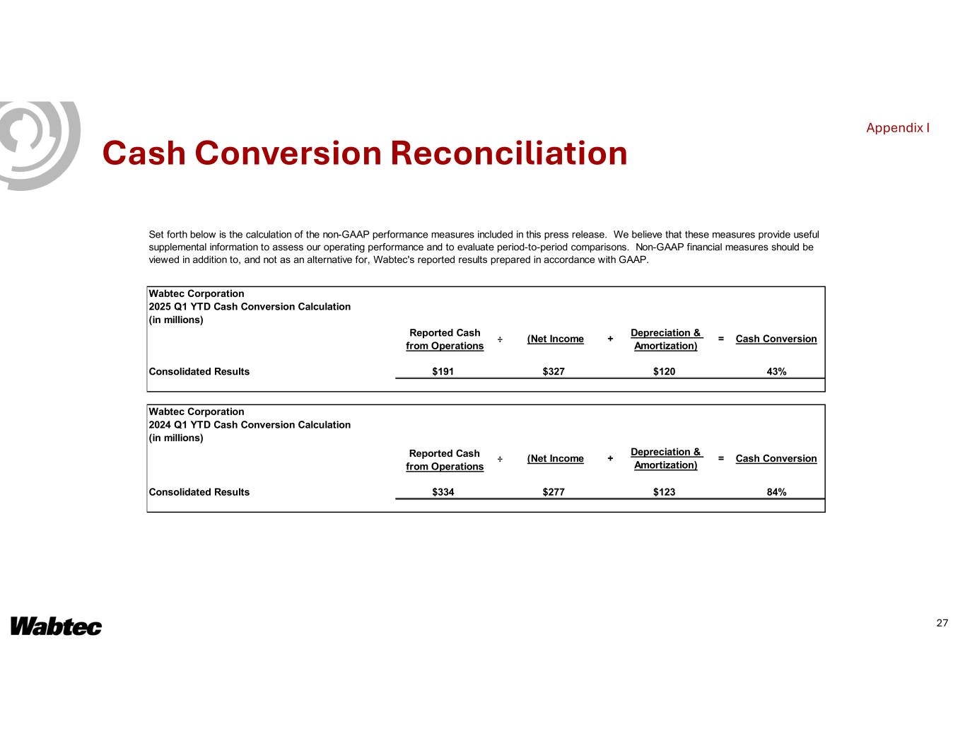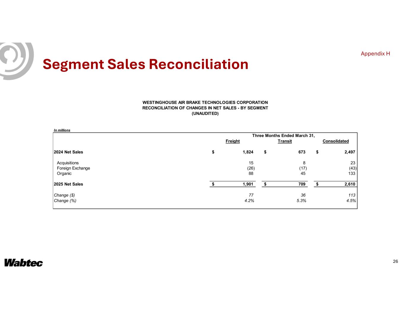Segment Sales Reconciliation 26 Appendix H In millions Freight Transit Consolidated 2024 Net Sales 1,824$ 673$ 2,497$ Acquisitions 15 8 23 Foreign Exchange (26) (17) (43) Organic 88 45 133 2025 Net Sales 1,901$ 709$ 2,610$ Change ($) 77 36 113 Change (%) 4.2% 5.3% 4.5% Three Months Ended March 31, WESTINGHOUSE AIR BRAKE TECHNOLOGIES CORPORATION RECONCILIATION OF CHANGES IN NET SALES - BY SEGMENT (UNAUDITED)