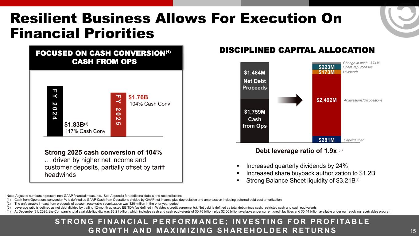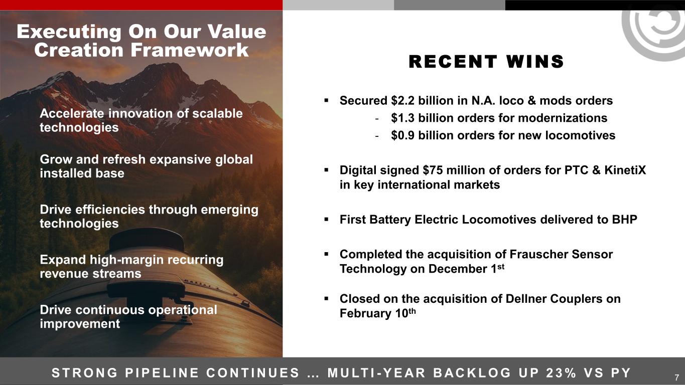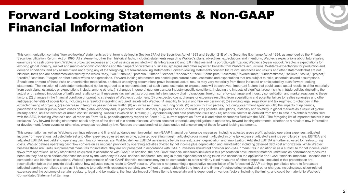 Forward Looking Statements & Non-GAAP Financial Information This communication contains “forward-looking” statements as that term is defined in Section 27A of the Securities Act of 1933 and Section 21E of the Securities Exchange Act of 1934, as amended by the Private Securities Litigation Reform Act of 1995. All statements, other than historical facts, including statements regarding Wabtec’s plans, objectives, expectations and intentions; Wabtec’s expectations about future sales, earnings and cash conversion; Wabtec’s projected expenses and cost savings associated with its Integration 2.0 and 3.0 initia tives and its portfolio optimization; Wabtec’s 5-year outlook; Wabtec’s expectations for evolving global industry, market and macro-economic conditions and their impact on Wabtec’s business; synergies and other expected benefits from Wabtec’s acquisitions; Wabtec’s expectations for production and demand conditions; and any assumptions underlying any of the foregoing, are forward-looking statements. Forward-looking statements concern future circumstances and results and other statements that are not historical facts and are sometimes identified by the words “may,” “will,” “should,” “potential,” “intend,” “expect,” “endeavor,” “seek,” “anticipate,” “estimate,” “overestimate,” “underestimate,” “believe,” “could,” “project,” “predict,” “continue,” “target” or other similar words or expressions. Forward-looking statements are based upon current plans, estimates and expectations that are subject to risks, uncertainties and assumptions. Should one or more of these risks or uncertainties materialize, or should underlying assumptions prove incorrect, actual results may vary materially from those indicated or anticipated by such forward-looking statements. The inclusion of such statements should not be regarded as a representation that such plans, estimates or expectations will be achieved. Important factors that could cause actual results to differ materially from such plans, estimates or expectations include, among others, (1) changes in general economic and/or industry specific conditions, including the impacts of significant recent shifts in trade policies (including the actual or threatened imposition of tariffs and retaliatory tariff measures) as well as tax programs, inflation, supply chain disruptions, foreign currency exchange and industry consolidation and market reactions to these factors; (2) changes in the financial condition or operating strategies of Wabtec's customers; (3) unexpected costs, charges or expenses resulting from acquisitions and potential failure to realize synergies and other anticipated benefits of acquisitions, including as a result of integrating acquired targets into Wabtec; (4) inability to retain and hire key personnel; (5) evolving legal, regulatory and tax regimes; (6) changes in the expected timing of projects; (7) a decrease in freight or passenger rail traffic; (8) an increase in manufacturing costs; (9) actions by third parties, including government agencies; (10) the impacts of epidemics, pandemics or similar public health crises on the global economy and, in particular, our customers, suppliers and end-markets, (11) potential disruptions, instability and volatility in global markets as a result of global military action, acts of terrorism or armed conflict, including Russia’s invasion of Ukraine; (12) cybersecurity and data protection risks and (13) other risk factors as detailed from time to time in Wabtec’s reports filed with the SEC, including Wabtec’s annual report on Form 10-K, periodic quarterly reports on Form 10-Q, current reports on Form 8-K and other documents filed with the SEC. The foregoing list of important factors is not exclusive. Any forward-looking statements speak only as of the date of this communication. Wabtec does not undertake any obligation to update any forward-looking statements, whether as a result of new information or development, future events or otherwise, except as required by law. Readers are cautioned not to place undue reliance on any of these forward-looking statements. This presentation as well as Wabtec’s earnings release and financial guidance mention certain non-GAAP financial performance measures, including adjusted gross profit, adjusted operating expenses, adjusted income from operations, adjusted interest and other expense, adjusted net income, adjusted operating margin, adjusted gross margin, adjusted income tax expense, adjusted earnings per diluted share, EBITDA and adjusted EBITDA, net debt and operating cash flow conversion rate. Wabtec defines EBITDA as earnings before interest, taxes, depreciation and amortization. Adjusted EBITDA is further adjusted for restructuring costs. Wabtec defines operating cash flow conversion as net cash provided by operating activities divided by net income plus depreciation and amortization including deferred debt cost amortization. While Wabtec believes these are useful supplemental measures for investors, they are not presented in accordance with GAAP. Investors should not consider non-GAAP measures in isolation or as a substitute for net income, cash flows from operations, or any other items calculated in accordance with GAAP. In addition, the non-GAAP financial measures included in this presentation have inherent material limitations as performance measures because they add back certain expenses incurred by the Company to GAAP financial measures, resulting in those expenses not being taken into account in the applicable non-GAAP financial measure. Because not all companies use identical calculations, Wabtec’s presentation of non-GAAP financial measures may not be comparable to other similarly titled measures of other companies. Included in this presentation are reconciliation tables that provide details about how adjusted results relate to GAAP results. Wabtec is not pre
