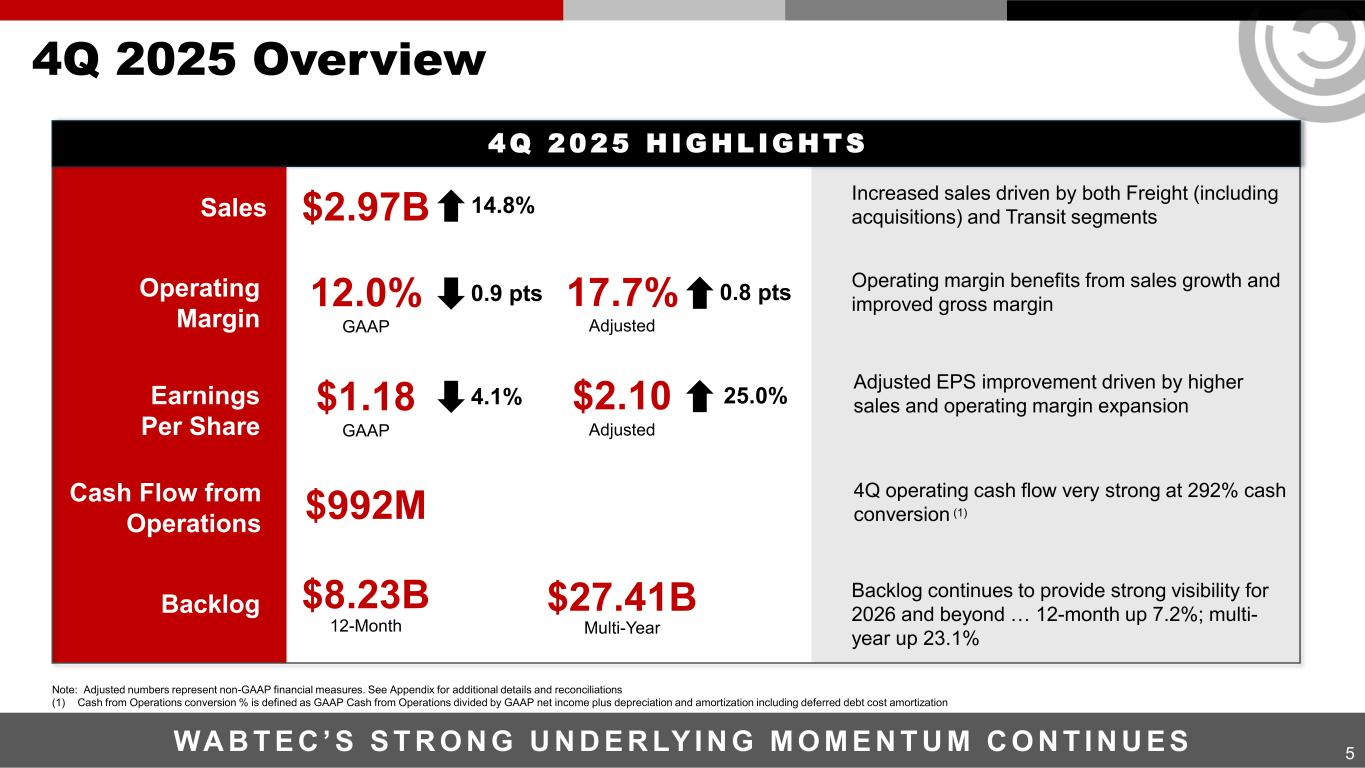 Wabtec Highlights Very strong financial performance in Q4 and FY 2025 Strong orders, backlog & pipeline momentum moving into 2026 M&A and integration initiatives driving value creation Positive financial outlook for 2026 & Beyond 4