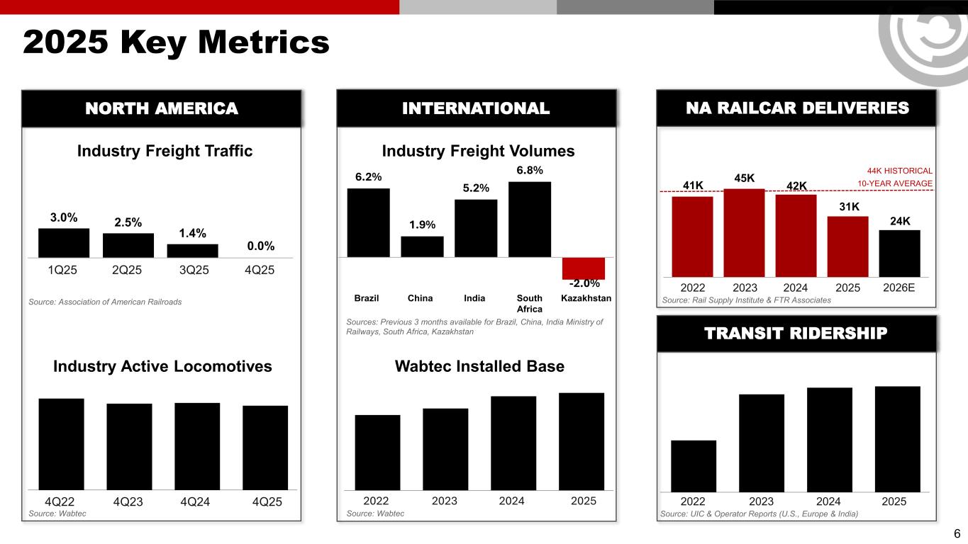 5 4Q 2025 Overview WA B T E C ’ S S T R O N G U N D E R LY I N G M O M E N T U M C O N T I N U E S Sales Increased sales driven by both Freight (including acquisitions) and Transit segments Operating margin benefits from sales growth and improved gross margin Adjusted EPS improvement driven by higher sales and operating margin expansion 4Q operating cash flow very strong at 292% cash conversion (1) Backlog continues to provide strong visibility for 2026 and beyond … 12-month up 7.2%; multi- year up 23.1% Cash Flow from Operations $992M Backlog $8.23B 12-Month Multi-Year $27.41B Operating Margin 12.0% GAAP 0.9 pts 17.7% Adjusted 0.8 pts Earnings Per Share $1.18 GAAP 4.1% $2.10 Adjusted 25.0% $2.97B 14.8% 4Q 2025 H IGHLIGHTS Note: Adjusted numbers represent non-GAAP financial measures. See Appendix for additional details and reconciliations (1) Cash from Operations conversion % is defined as GAAP Cash from Operations divided by GAAP net income plus depreciation and amortization including deferred debt cost amortization