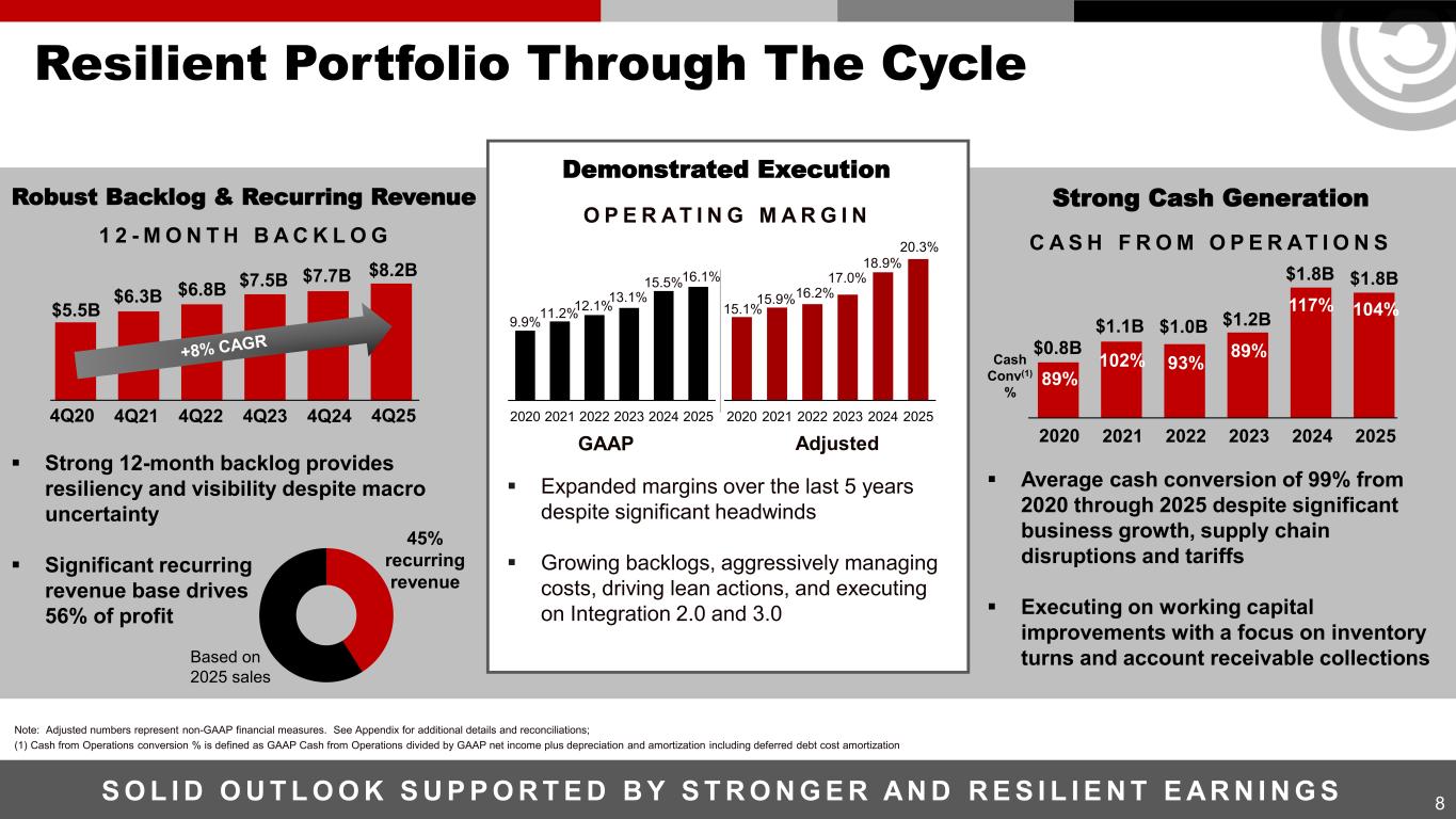 8 Resilient Portfolio Through The Cycle Demonstrated Execution Robust Backlog & Recurring Revenue Strong Cash Generation 2020 2021 2022 2023 2024 20252020 2021 2022 2023 2024 2025 ▪ Expanded margins over the last 5 years despite significant headwinds ▪ Growing backlogs, aggressively managing costs, driving lean actions, and executing on Integration 2.0 and 3.0 16.2% O P E R AT I N G M A R G I N 18.9% 17.0%15.5% 13.1% 12.1% GAAP Adjusted 15.9% 16.1% 20.3% 11.2% ▪ Strong 12-month backlog provides resiliency and visibility despite macro uncertainty ▪ Significant recurring revenue base drives 56% of profit 4Q21 4Q24 $7.7B$7.5B 45% recurring revenue 4Q22 4Q23 $6.8B$6.3B Based on 2025 sales 4Q25 $8.2B S O L I D O U T L O O K S U P P O R T E D B Y S T R O N G E R AN D R E S I L I E N T E AR N I N G S Note: Adjusted numbers represent non-GAAP financial measures. See Appendix for additional details and reconciliations; (1) Cash from Operations conversion % is defined as GAAP Cash from Operations divided by GAAP net income plus depreciation and amortization including deferred debt cost amortization $1.1B $1.0B $1.2B $1.8B 2021 2022 2023 2024 2025 $1.8B C A S H F R O M O P E R AT I O N S ▪ Average cash conversion of 99% from 2020 through 2025 despite significant business growth, supply chain disruptions and tariffs ▪ Executing on working capital improvements with a focus on inventory turns and account receivable collections 104% 102% 93% 89% 117% Cash Conv(1) % 1 2 - M O N T H B A C K L O G $5.5B 4Q20 $0.8B 89% 2020 15.1% 9.9%