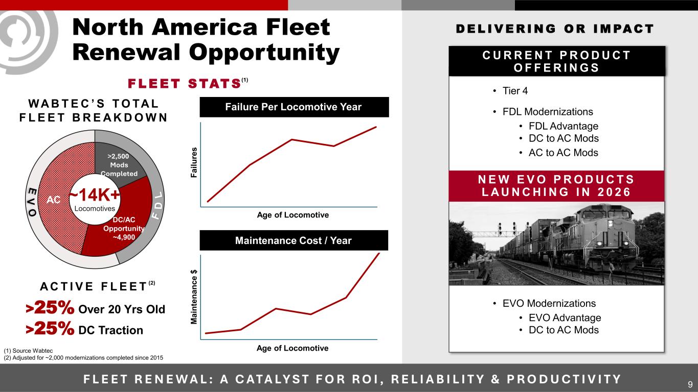 >2,500 Mods Completed ~14K+ Locomotives E V O F D L AC DC/AC Opportunity ~4,900 F L E E T S TAT S C U R R E N T P R O D U C T O F F E R I N G S Failure Per Locomotive Year Maintenance Cost / Year Age of Locomotive Age of Locomotive WA B T E C ’ S T O TA L F L E E T B R E A K D O W N • EVO Modernizations • EVO Advantage • DC to AC Mods N E W E V O P R O D U C T S L A U N C H I N G I N 2 0 2 6 >25% Over 20 Yrs Old >25% DC Traction North America Fleet Renewal Opportunity 9 D E L I V E R I N G O R I M PA C T A C T I V E F L E E T • Tier 4 • FDL Modernizations • FDL Advantage • DC to AC Mods • AC to AC Mods (2) (1) Source Wabtec (2) Adjusted for ~2,000 modernizations completed since 2015 (1) F L E E T R E N E W A L : A C A T A L Y S T F O R R O I , R E L I A B I L I T Y & P R O D U C T I V I T Y M a in te n a n c e $ F a il u re s