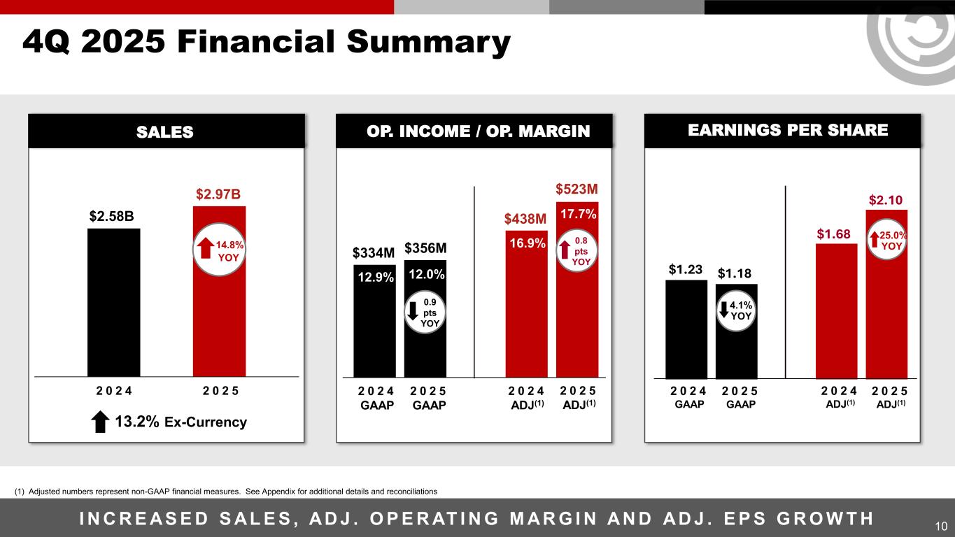 $1.23 $1.18 $1.68 $2.10 10 4Q 2025 Financial Summary I N C R E AS E D S AL E S , AD J . O P E R AT I N G M AR G I N AN D AD J . E P S G R O W T H (1) Adjusted numbers represent non-GAAP financial measures. See Appendix for additional details and reconciliations 2 0 2 4 GAAP 2 0 2 5 GAAP 2 0 2 4 ADJ(1) 2 0 2 5 ADJ(1) $334M 12.9% 12.0% $438M 16.9% $523M 17.7% $356M 2 0 2 4 2 0 2 5 2 0 2 4 GAAP 2 0 2 5 GAAP 2 0 2 4 ADJ(1) 2 0 2 5 ADJ(1) $2.97B $2.58B 14.8% YOY 4.1% YOY 25.0% YOY 13.2% Ex-Currency OP. INCOME / OP. MARGIN EARNINGS PER SHARESALES 0.9 pts YOY 0.8 pts YOY
