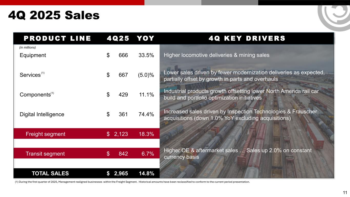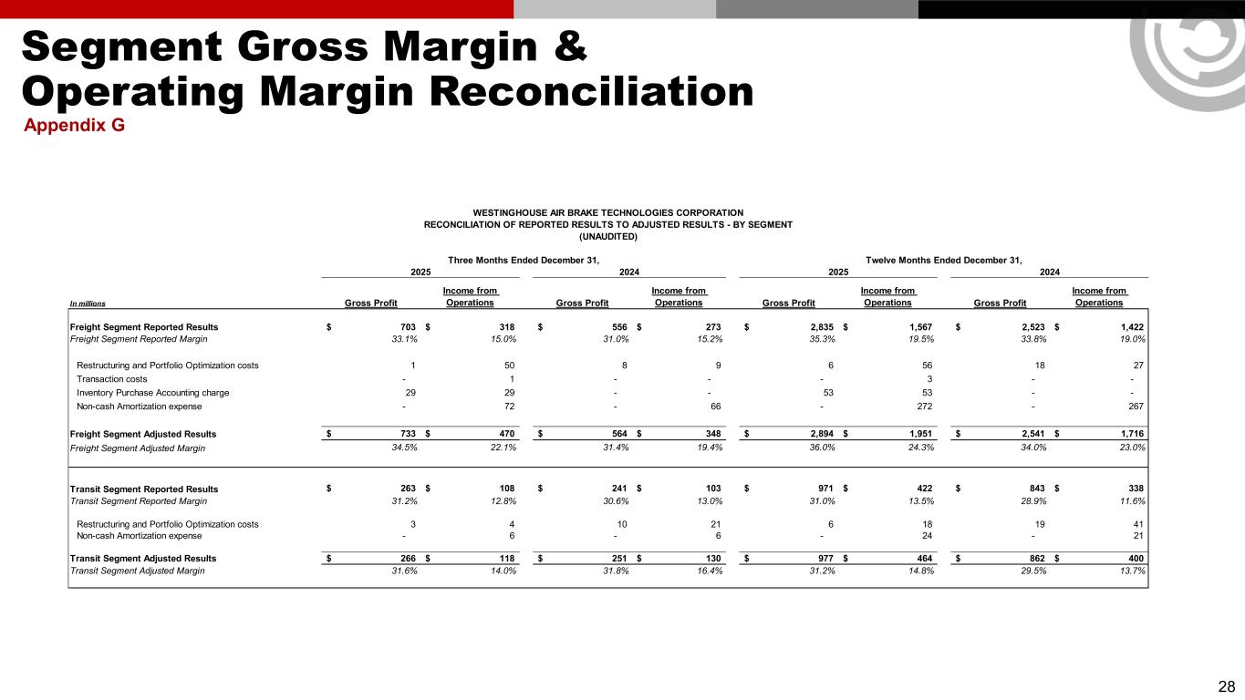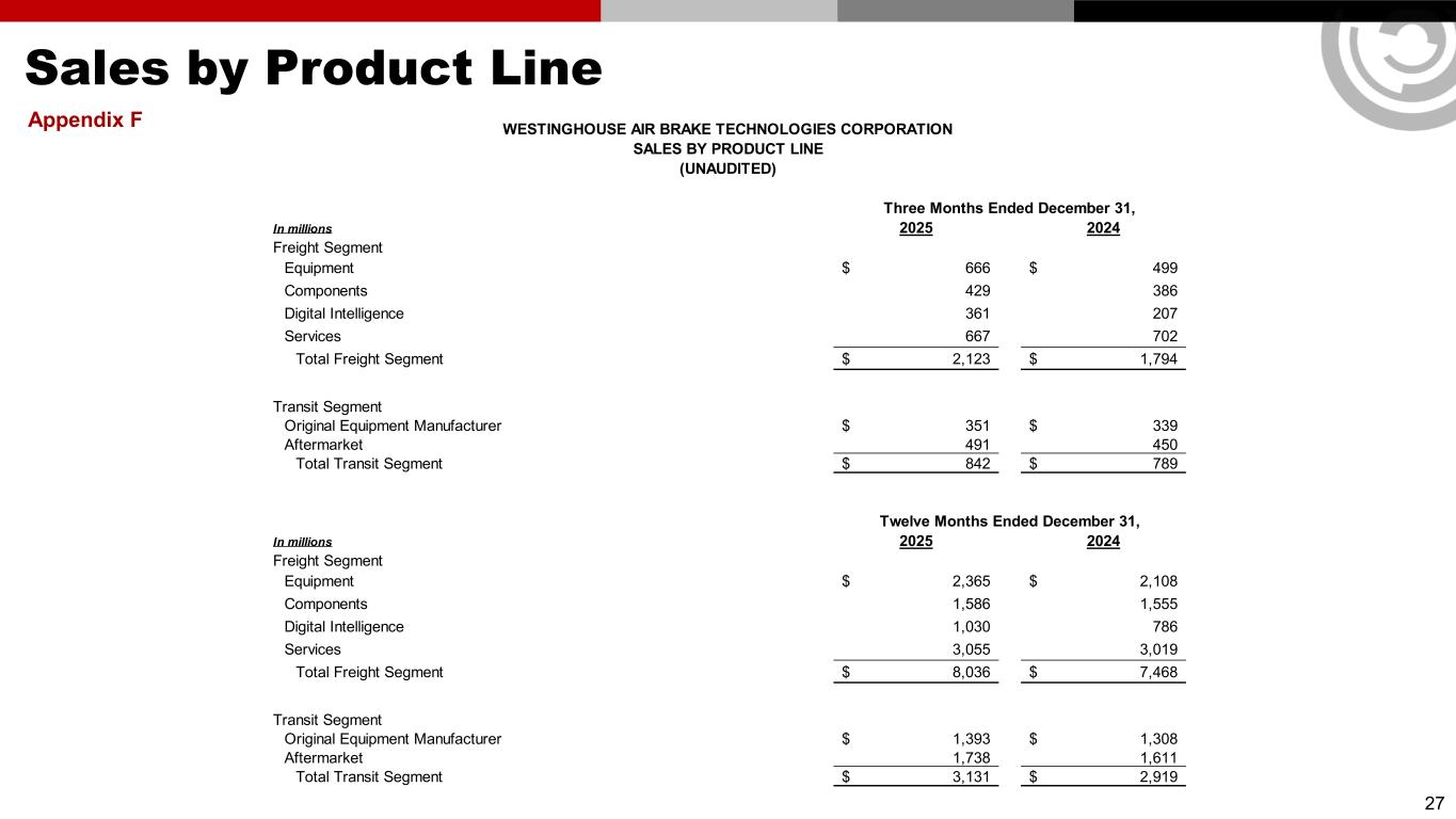 Sales by Product Line Appendix F 27 In millions 2025 2024 Freight Segment Equipment 666$ 499$ Components 429 386 Digital Intelligence 361 207 Services 667 702 Total Freight Segment 2,123$ 1,794$ Transit Segment Original Equipment Manufacturer 351$ 339$ Aftermarket 491 450 Total Transit Segment 842$ 789$ In millions 2025 2024 Freight Segment Equipment 2,365$ 2,108$ Components 1,586 1,555 Digital Intelligence 1,030 786 Services 3,055 3,019 Total Freight Segment 8,036$ 7,468$ Transit Segment Original Equipment Manufacturer 1,393$ 1,308$ Aftermarket 1,738 1,611 Total Transit Segment 3,131$ 2,919$ Twelve Months Ended December 31, WESTINGHOUSE AIR BRAKE TECHNOLOGIES CORPORATION SALES BY PRODUCT LINE (UNAUDITED) Three Months Ended December 31,