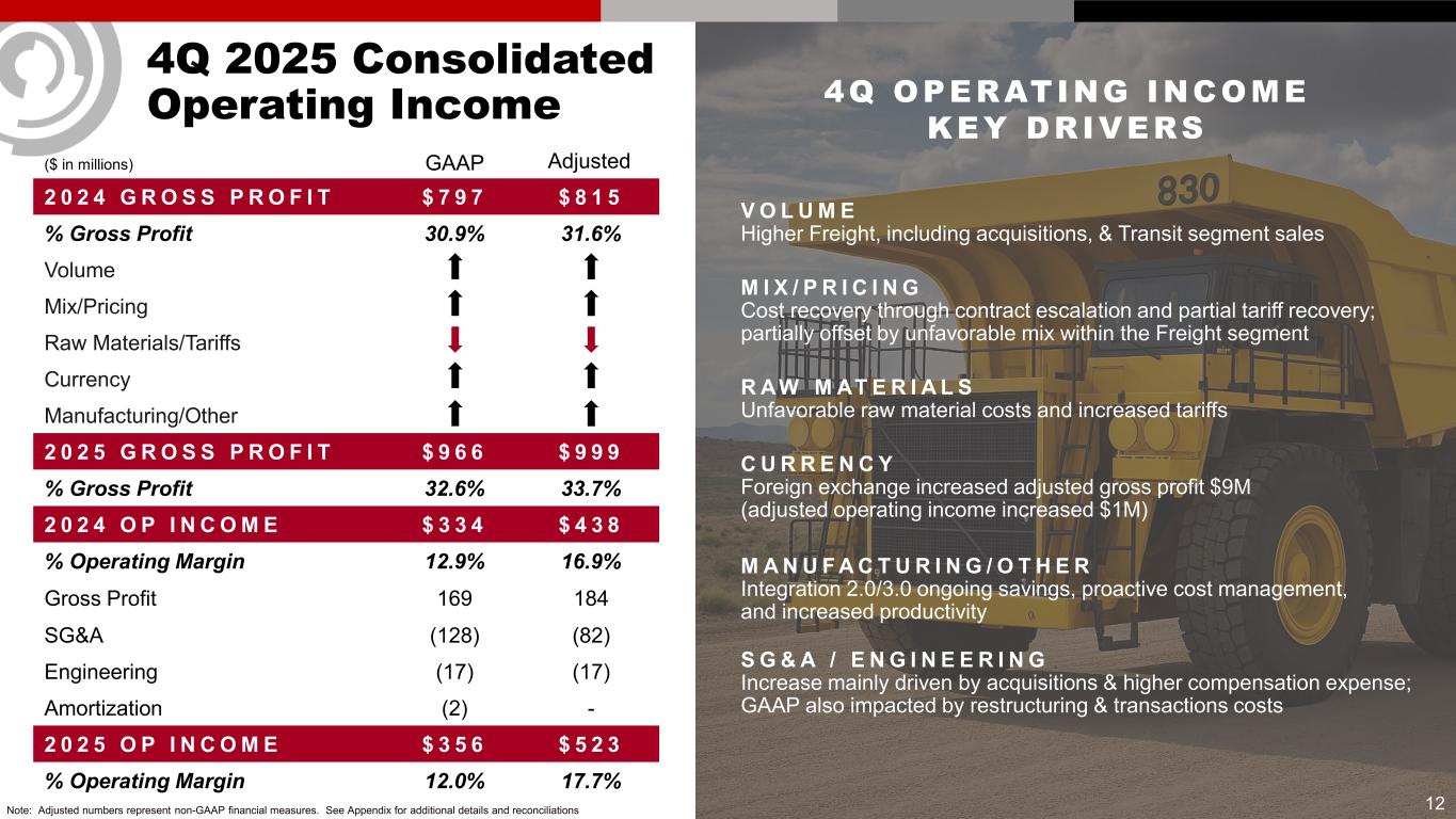 4Q 2025 Sales 11 PROD UC T L INE 4Q25 YOY 4Q KEY D R IV ER S (in millions) Equipment $ 666 33.5% Services $ 667 (5.0)% Components $ 429 11.1% Digital Intelligence $ 361 74.4% Freight segment $ 2,123 18.3% Transit segment $ 842 6.7% TOTAL SALES $ 2,965 14.8% Lower sales driven by fewer modernization deliveries as expected, partially offset by growth in parts and overhauls Higher locomotive deliveries & mining sales Industrial products growth offsetting lower North America rail car build and portfolio optimization initiatives Increased sales driven by Inspection Technologies & Frauscher acquisitions (down 1.0% YoY excluding acquisitions) Higher OE & aftermarket sales … Sales up 2.0% on constant currency basis (1) During the first quarter of 2025, Management realigned businesses within the Freight Segment. Historical amounts have been reclassified to conform to the current period presentation. (1) (1)