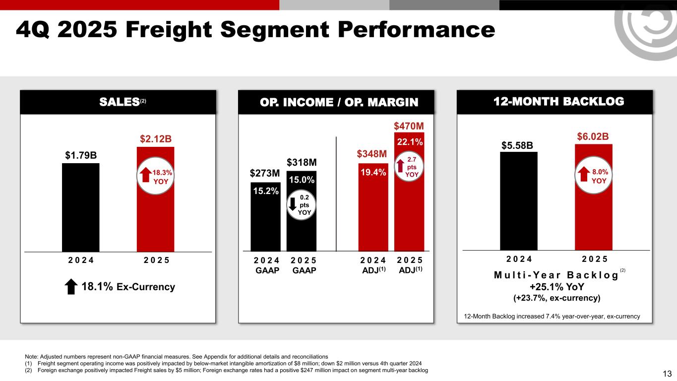 12 4Q 2025 Consolidated Operating Income ($ in millions) 2 0 2 4 G R O S S P R O F I T $ 7 9 7 $ 8 1 5 % Gross Profit 30.9% 31.6% Volume Mix/Pricing Raw Materials/Tariffs Currency Manufacturing/Other 2 0 2 5 G R O S S P R O F I T $ 9 6 6 $ 9 9 9 % Gross Profit 32.6% 33.7% 2 0 2 4 O P I N C O M E $ 3 3 4 $ 4 3 8 % Operating Margin 12.9% 16.9% Gross Profit 169 184 SG&A (128) (82) Engineering (17) (17) Amortization (2) - 2 0 2 5 O P I N C O M E $ 3 5 6 $ 5 2 3 % Operating Margin 12.0% 17.7% GAAP Adjusted Note: Adjusted numbers represent non-GAAP financial measures. See Appendix for additional details and reconciliations V O L U M E Higher Freight, including acquisitions, & Transit segment sales M I X / P R I C I N G Cost recovery through contract escalation and partial tariff recovery; partially offset by unfavorable mix within the Freight segment R AW M AT E R I A L S Unfavorable raw material costs and increased tariffs C U R R E N C Y Foreign exchange increased adjusted gross profit $9M (adjusted operating income increased $1M) M A N U F A C T U R I N G / O T H E R Integration 2.0/3.0 ongoing savings, proactive cost management, and increased productivity S G & A / E N G I N E E R I N G Increase mainly driven by acquisitions & higher compensation expense; GAAP also impacted by restructuring & transactions costs 4Q OPERATING INCOME KEY DRIVERS