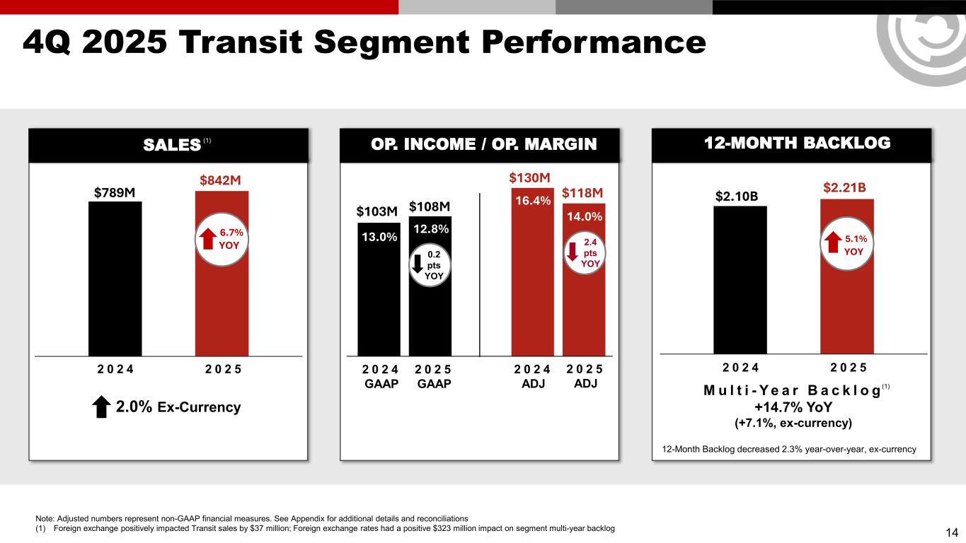 13 4Q 2025 Freight Segment Performance 2 0 2 4 GAAP 2 0 2 5 GAAP 2 0 2 4 ADJ(1) 2 0 2 5 ADJ(1) $273M 15.0% 15.2% $348M 19.4% $470M 22.1% $318M 2 0 2 4 2 0 2 5 $2.12B $1.79B 18.3% YOY 2 0 2 4 2 0 2 5 $6.02B $5.58B 8.0% YOY Note: Adjusted numbers represent non-GAAP financial measures. See Appendix for additional details and reconciliations (1) Freight segment operating income was positively impacted by below-market intangible amortization of $8 million; down $2 million versus 4th quarter 2024 (2) Foreign exchange positively impacted Freight sales by $5 million; Foreign exchange rates had a positive $247 million impact on segment multi-year backlog 12-Month Backlog increased 7.4% year-over-year, ex-currency M u l t i - Y e a r B a c k l o g +25.1% YoY (+23.7%, ex-currency) 18.1% Ex-Currency OP. INCOME / OP. MARGIN 12-MONTH BACKLOGSALES(2) 0.2 pts YOY 2.7 pts YOY (2)