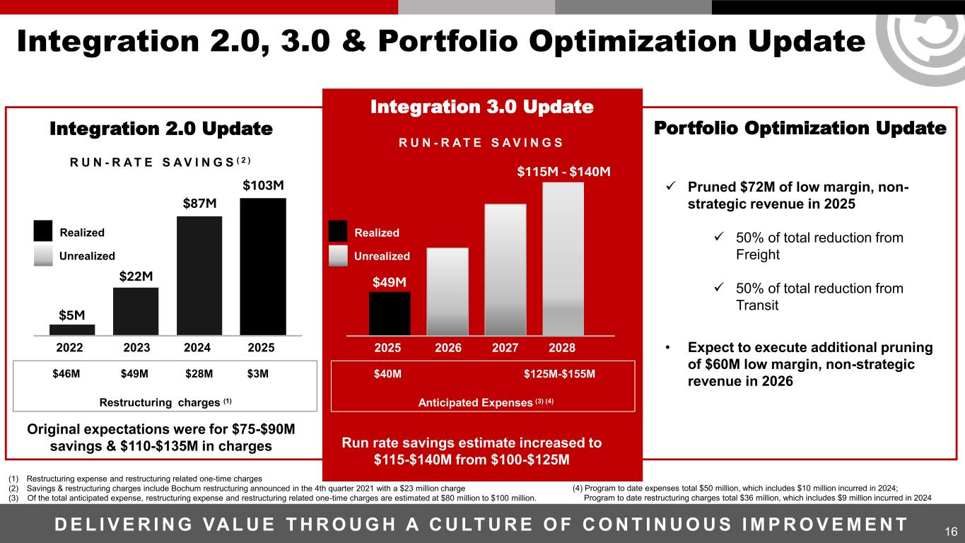 16 Integration 2.0, 3.0 & Portfolio Optimization Update Integration 2.0 Update Integration 3.0 Update $5M R U N - R A T E S A V I N G S ( 2 ) Unrealized Restructuring charges (1) $46M $3M $22M $49M $87M $28M $103M Realized Original expectations were for $75-$90M savings & $110-$135M in charges (1) Restructuring expense and restructuring related one-time charges (2) Savings & restructuring charges include Bochum restructuring announced in the 4th quarter 2021 with a $23 million charge (3) Of the total anticipated expense, restructuring expense and restructuring related one-time charges are estimated at $80 million to $100 million. 2022 2023 2024 2025 $49M R U N - R A T E S A V I N G S Unrealized Anticipated Expenses (3) (4) $40M $125M-$155M $115M - $140M Realized Run rate savings estimate increased to $115-$140M from $100-$125M 2025 2026 2027 2028 Portfolio Optimization Update ✓ Pruned $72M of low margin, non- strategic revenue in 2025 ✓ 50% of total reduction from Freight ✓ 50% of total reduction from Transit • Expect to execute additional pruning of $60M low margin, non-strategic revenue in 2026 D E L I V E R I N G VAL U E T H R O U G H A C U LT U R E O F C O N T I N U O U S I M P R O V E M E N T (4) Program to date expenses total $50 million, which includes $10 million incurred in 2024; Program to date restructuring charges total $36 million, which includes $9 million incurred in 2024