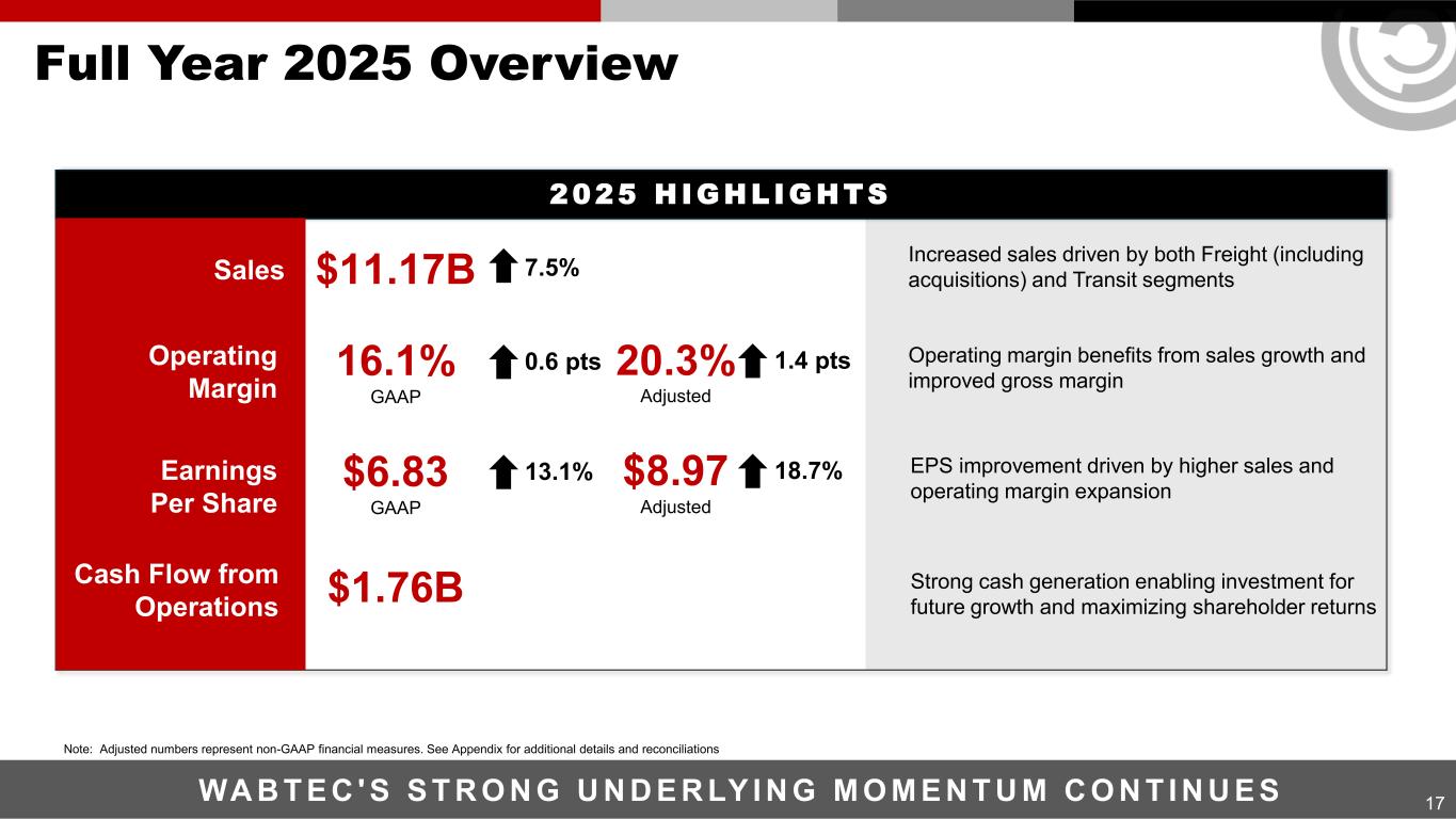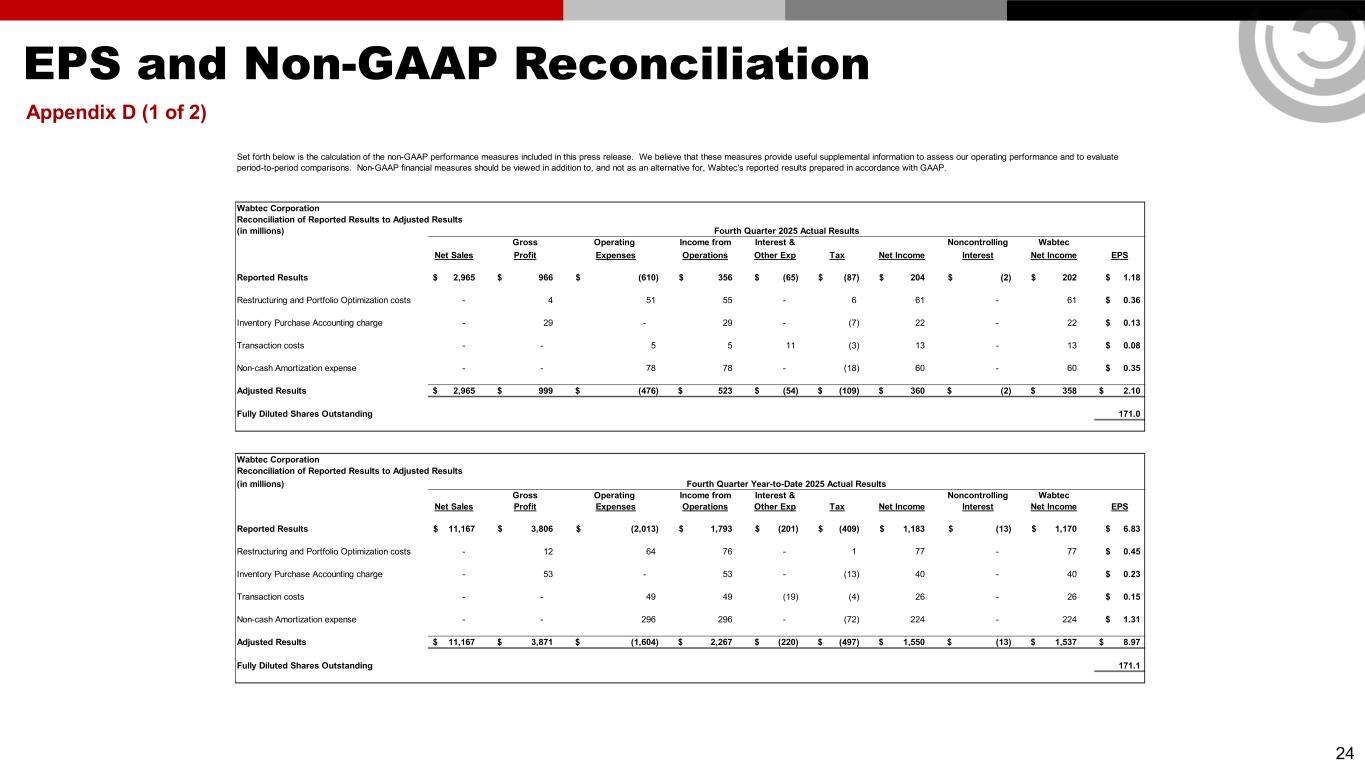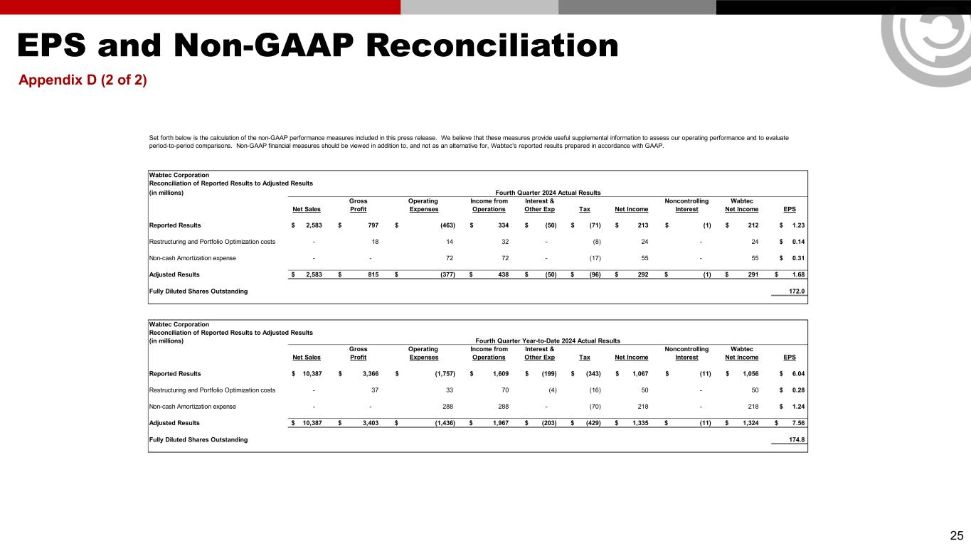 EPS and Non-GAAP Reconciliation Appendix D (1 of 2) 24 Wabtec Corporation Reconciliation of Reported Results to Adjusted Results (in millions) Gross Operating Income from Interest & Noncontrolling Wabtec Net Sales Profit Expenses Operations Other Exp Tax Net Income Interest Net Income EPS Reported Results 2,965$ 966$ (610)$ 356$ (65)$ (87)$ 204$ (2)$ 202$ 1.18$ Restructuring and Portfolio Optimization costs - 4 51 55 - 6 61 - 61 0.36$ Inventory Purchase Accounting charge - 29 - 29 - (7) 22 - 22 0.13$ Transaction costs - - 5 5 11 (3) 13 - 13 0.08$ Non-cash Amortization expense - - 78 78 - (18) 60 - 60 0.35$ Adjusted Results 2,965$ 999$ (476)$ 523$ (54)$ (109)$ 360$ (2)$ 358$ 2.10$ Fully Diluted Shares Outstanding 171.0 Wabtec Corporation Reconciliation of Reported Results to Adjusted Results (in millions) Gross Operating Income from Interest & Noncontrolling Wabtec Net Sales Profit Expenses Operations Other Exp Tax Net Income Interest Net Income EPS Reported Results 11,167$ 3,806$ (2,013)$ 1,793$ (201)$ (409)$ 1,183$ (13)$ 1,170$ 6.83$ Restructuring and Portfolio Optimization costs - 12 64 76 - 1 77 - 77 0.45$ Inventory Purchase Accounting charge - 53 - 53 - (13) 40 - 40 0.23$ Transaction costs - - 49 49 (19) (4) 26 - 26 0.15$ Non-cash Amortization expense - - 296 296 - (72) 224 - 224 1.31$ Adjusted Results 11,167$ 3,871$ (1,604)$ 2,267$ (220)$ (497)$ 1,550$ (13)$ 1,537$ 8.97$ Fully Diluted Shares Outstanding 171.1 Set forth below is the calculation of the non-GAAP performance measures included in this press release.  We believe that these measures provide useful supplemental information to assess our operating performance and to evaluate period-to-period comparisons.  Non-GAAP financial measures should be viewed in addition to, and not as an alternative for, Wabtec's reported results prepared in accordance with GAAP. Fourth Quarter 2025 Actual Results Fourth Quarter Year-to-Date 2025 Actual Results