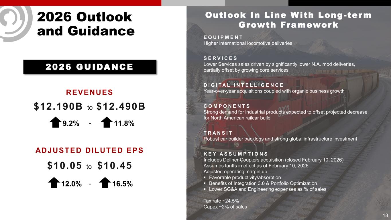 2026 Outlook and Guidance 2026 GUIDANCE REVENUES $12.190B to $12.490B ADJUSTED DILUTED EPS $10.05 to $10.45 9.2% 11.8% 12.0% 16.5%- - Outlook In Line With Long-term Growth Framework E Q U I P M E N T Higher international locomotive deliveries C O M P O N E N T S Strong demand for industrial products expected to offset projected decrease for North American railcar build S E R V I C E S Lower Services sales driven by significantly lower N.A. mod deliveries, partially offset by growing core services D I G I T A L I N T E L L I G E N C E Year-over-year acquisitions coupled with organic business growth T R A N S I T Robust car builder backlogs and strong global infrastructure investment K E Y A S S U M P T I O N S Includes Dellner Couplers acquisition (closed February 10, 2026) Assumes tariffs in effect as of February 10, 2026 Adjusted operating margin up ▪ Favorable productivity/absorption ▪ Benefits of Integration 3.0 & Portfolio Optimization ▪ Lower SG&A and Engineering expenses as % of sales Tax rate ~24.5% Capex ~2% of sales 18