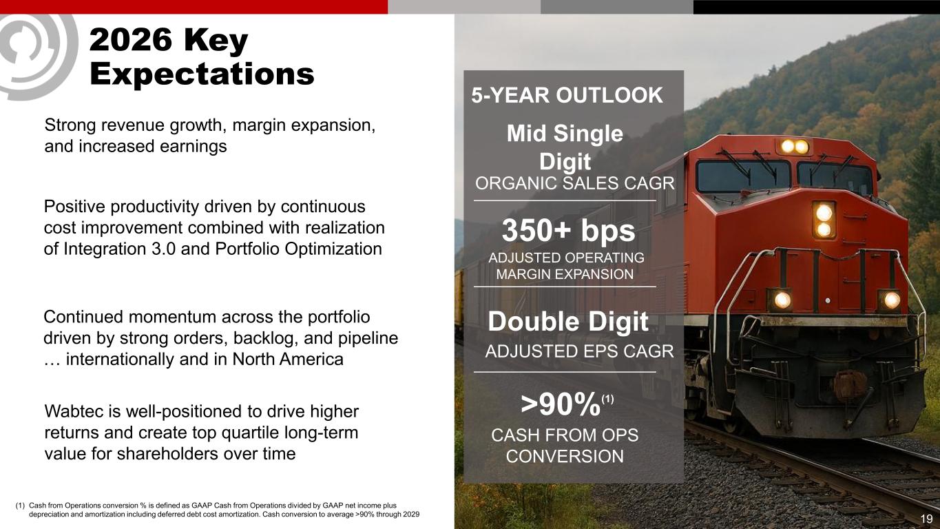 19 2026 Key Expectations Continued momentum across the portfolio driven by strong orders, backlog, and pipeline … internationally and in North America Positive productivity driven by continuous cost improvement combined with realization of Integration 3.0 and Portfolio Optimization Wabtec is well-positioned to drive higher returns and create top quartile long-term value for shareholders over time Strong revenue growth, margin expansion, and increased earnings 5-YEAR OUTLOOK Mid Single Digit ORGANIC SALES CAGR Double Digit ADJUSTED EPS CAGR >90%(1) CASH FROM OPS CONVERSION 350+ bps ADJUSTED OPERATING MARGIN EXPANSION (1) Cash from Operations conversion % is defined as GAAP Cash from Operations divided by GAAP net income plus depreciation and amortization including deferred debt cost amortization. Cash conversion to average >90% through 2029