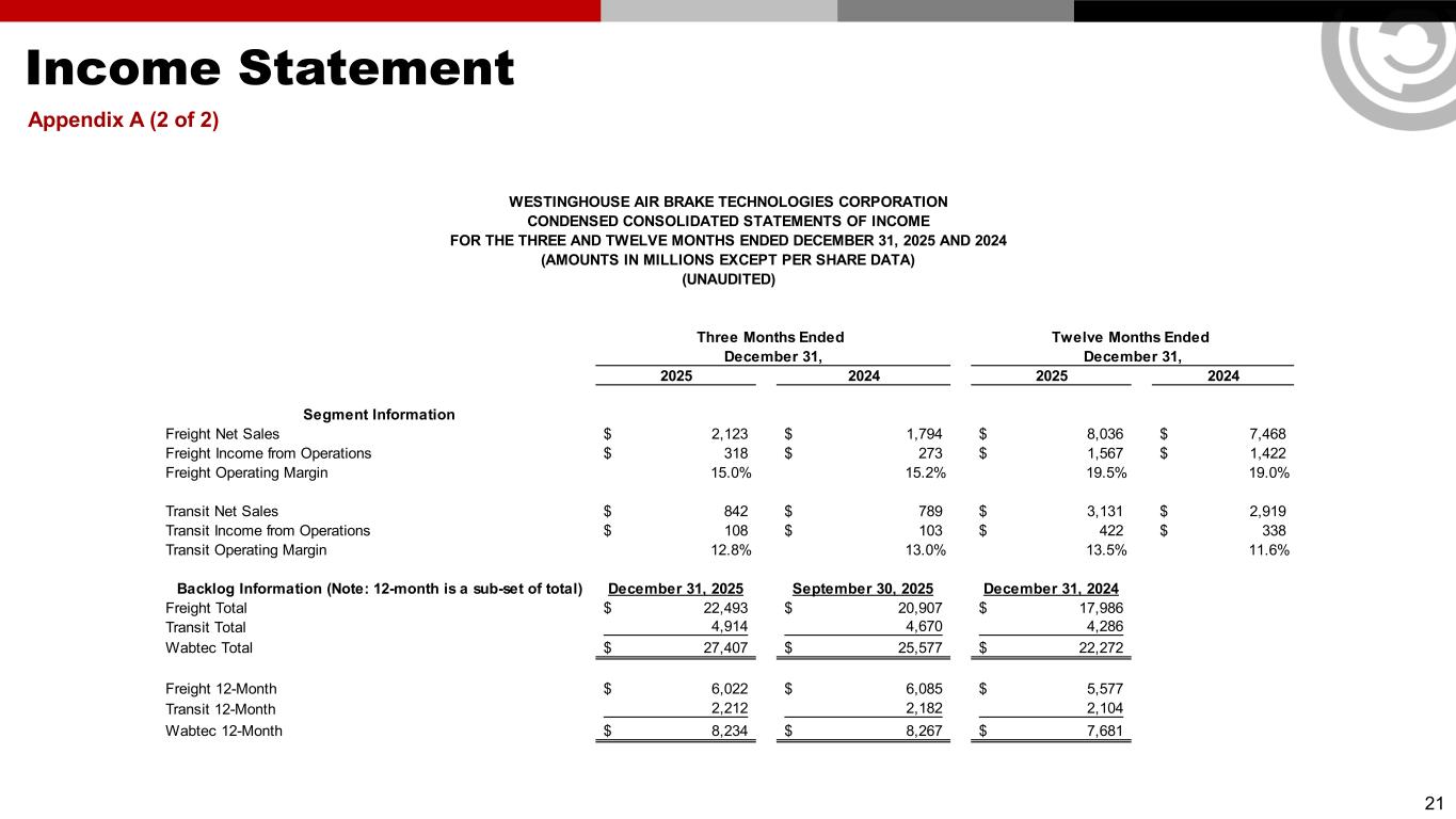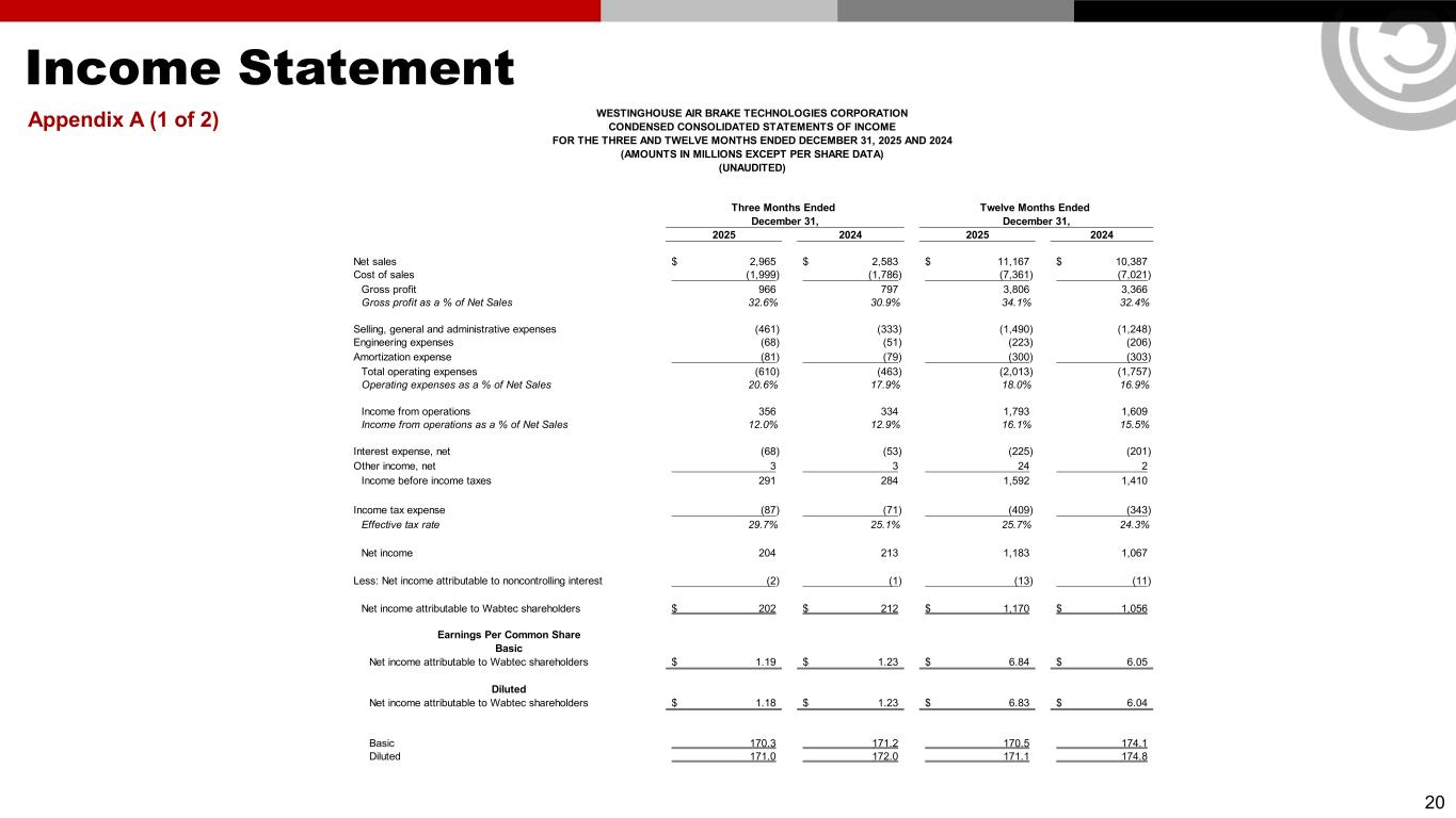 Income Statement Appendix A (1 of 2) 20 2025 2024 2025 2024 Net sales 2,965$ 2,583$ 11,167$ 10,387$ Cost of sales (1,999) (1,786) (7,361) (7,021) Gross profit 966 797 3,806 3,366 Gross profit as a % of Net Sales 32.6% 30.9% 34.1% 32.4% Selling, general and administrative expenses (461) (333) (1,490) (1,248) Engineering expenses (68) (51) (223) (206) Amortization expense (81) (79) (300) (303) Total operating expenses (610) (463) (2,013) (1,757) Operating expenses as a % of Net Sales 20.6% 17.9% 18.0% 16.9% Income from operations 356 334 1,793 1,609 Income from operations as a % of Net Sales 12.0% 12.9% 16.1% 15.5% Interest expense, net (68) (53) (225) (201) Other income, net 3 3 24 2 Income before income taxes 291 284 1,592 1,410 Income tax expense (87) (71) (409) (343) Effective tax rate 29.7% 25.1% 25.7% 24.3% Net income 204 213 1,183 1,067 Less: Net income attributable to noncontrolling interest (2) (1) (13) (11) Net income attributable to Wabtec shareholders 202$ 212$ 1,170$ 1,056$ Earnings Per Common Share Basic Net income attributable to Wabtec shareholders 1.19$ 1.23$ 6.84$ 6.05$ Diluted Net income attributable to Wabtec shareholders 1.18$ 1.23$ 6.83$ 6.04$ Basic 170.3 171.2 170.5 174.1 Diluted 171.0 172.0 171.1 174.8 December 31, December 31, Three Months Ended Twelve Months Ended WESTINGHOUSE AIR BRAKE TECHNOLOGIES CORPORATION CONDENSED CONSOLIDATED STATEMENTS OF INCOME FOR THE THREE AND TWELVE MONTHS ENDED DECEMBER 31, 2025 AND 2024 (AMOUNTS IN MILLIONS EXCEPT PER SHARE DATA) (UNAUDITED)