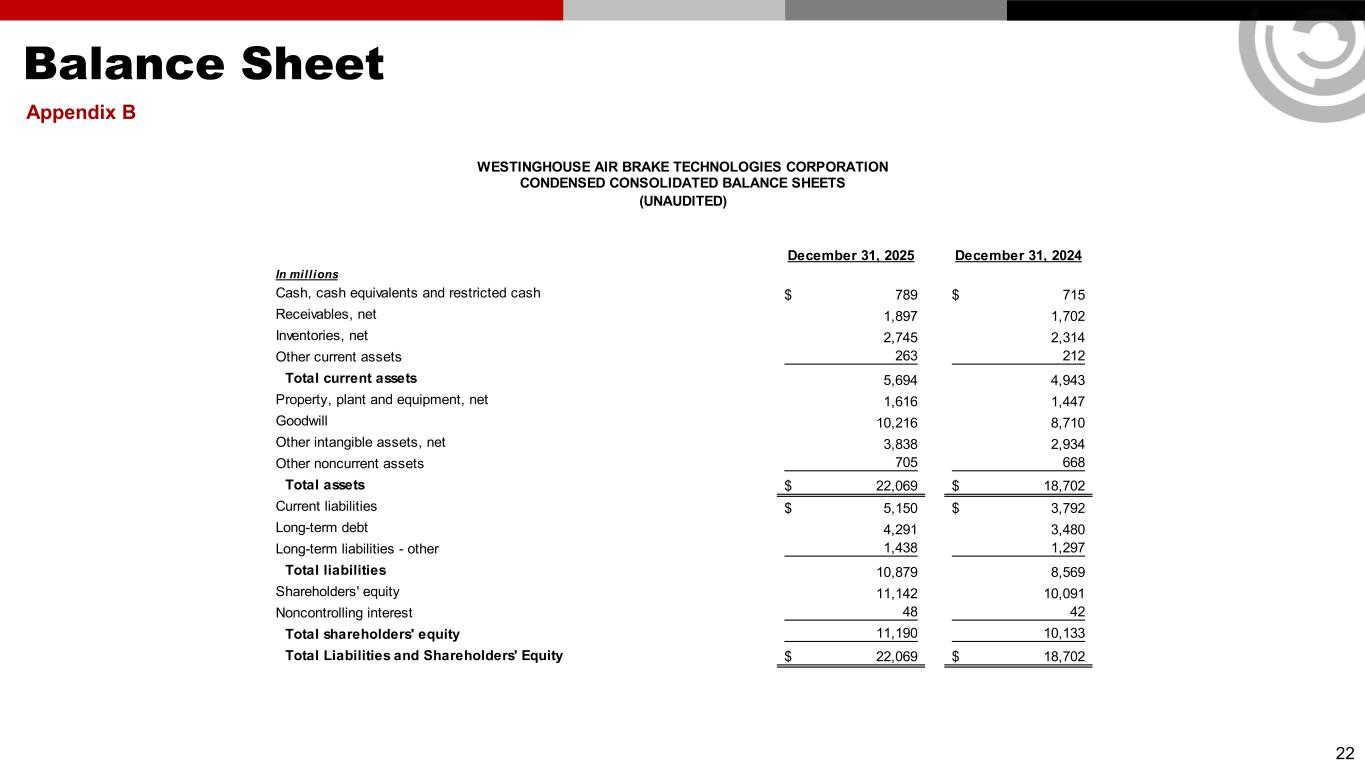 Balance Sheet Appendix B 22 December 31, 2025 December 31, 2024 In millions Cash, cash equivalents and restricted cash 789$ 715$ Receivables, net 1,897 1,702 Inventories, net 2,745 2,314 Other current assets 263 212 Total current assets 5,694 4,943 Property, plant and equipment, net 1,616 1,447 Goodwill 10,216 8,710 Other intangible assets, net 3,838 2,934 Other noncurrent assets 705 668 Total assets 22,069$ 18,702$ Current liabilities 5,150$ 3,792$ Long-term debt 4,291 3,480 Long-term liabilities - other 1,438 1,297 Total liabilities 10,879 8,569 Shareholders' equity 11,142 10,091 Noncontrolling interest 48 42 Total shareholders' equity 11,190 10,133 Total Liabilities and Shareholders' Equity 22,069$ 18,702$ WESTINGHOUSE AIR BRAKE TECHNOLOGIES CORPORATION CONDENSED CONSOLIDATED BALANCE SHEETS (UNAUDITED)