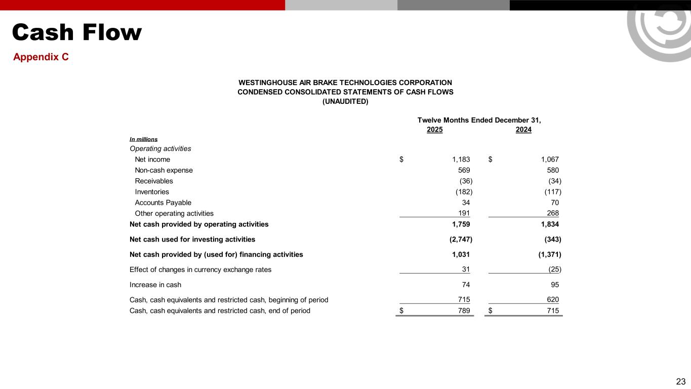 Cash Flow Appendix C 23 2025 2024 In millions Operating activities Net income 1,183$ 1,067$ Non-cash expense 569 580 Receivables (36) (34) Inventories (182) (117) Accounts Payable 34 70 Other operating activities 191 268 Net cash provided by operating activities 1,759 1,834 Net cash used for investing activities (2,747) (343) Net cash provided by (used for) financing activities 1,031 (1,371) Effect of changes in currency exchange rates 31 (25) Increase in cash 74 95 Cash, cash equivalents and restricted cash, beginning of period 715 620 Cash, cash equivalents and restricted cash, end of period 789$ 715$ WESTINGHOUSE AIR BRAKE TECHNOLOGIES CORPORATION CONDENSED CONSOLIDATED STATEMENTS OF CASH FLOWS (UNAUDITED) Twelve Months Ended December 31,