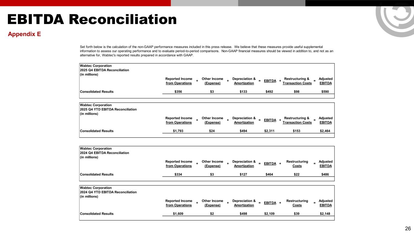 EBITDA Reconciliation Appendix E 26 Wabtec Corporation 2025 Q4 EBITDA Reconciliation (in millions) Reported Income Other Income Depreciation & Restructuring & Adjusted from Operations (Expense) Amortization Transaction Costs EBITDA Consolidated Results $356 $3 $133 $492 $98 $590 Wabtec Corporation 2025 Q4 YTD EBITDA Reconciliation (in millions) Reported Income Other Income Depreciation & Restructuring & Adjusted from Operations (Expense) Amortization Transaction Costs EBITDA Consolidated Results $1,793 $24 $494 $2,311 $153 $2,464 Wabtec Corporation 2024 Q4 EBITDA Reconciliation (in millions) Reported Income Other Income Depreciation & Restructuring Adjusted from Operations (Expense) Amortization Costs EBITDA Consolidated Results $334 $3 $127 $464 $22 $486 Wabtec Corporation 2024 Q4 YTD EBITDA Reconciliation (in millions) Reported Income Other Income Depreciation & Restructuring Adjusted from Operations (Expense) Amortization Costs EBITDA Consolidated Results $1,609 $2 $498 $2,109 $39 $2,148 Set forth below is the calculation of the non-GAAP performance measures included in this press release.  We believe that these measures provide useful supplemental information to assess our operating performance and to evaluate period-to-period comparisons.  Non-GAAP financial measures should be viewed in addition to, and not as an alternative for, Wabtec's reported results prepared in accordance with GAAP. + + = EBITDA + = = =+ + = EBITDA + + + = EBITDA + =+ + = EBITDA +