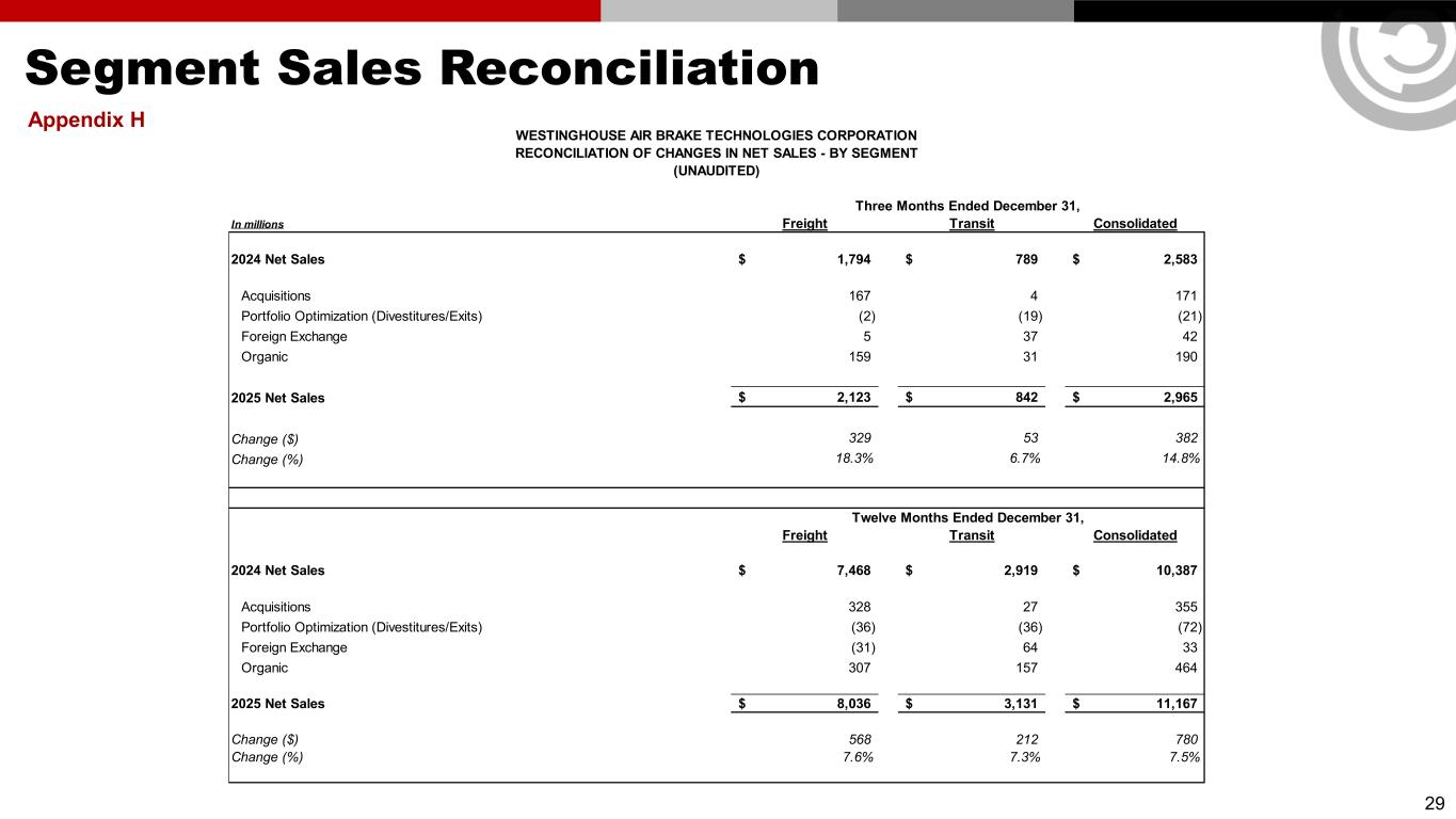 Segment Sales Reconciliation Appendix H 29 In millions Freight Transit Consolidated 2024 Net Sales 1,794$ 789$ 2,583$ Acquisitions 167 4 171 Portfolio Optimization (Divestitures/Exits) (2) (19) (21) Foreign Exchange 5 37 42 Organic 159 31 190 2025 Net Sales 2,123$ 842$ 2,965$ Change ($) 329 53 382 Change (%) 18.3% 6.7% 14.8% Freight Transit Consolidated 2024 Net Sales 7,468$ 2,919$ 10,387$ Acquisitions 328 27 355 Portfolio Optimization (Divestitures/Exits) (36) (36) (72) Foreign Exchange (31) 64 33 Organic 307 157 464 2025 Net Sales 8,036$ 3,131$ 11,167$ Change ($) 568 212 780 Change (%) 7.6% 7.3% 7.5% Twelve Months Ended December 31, WESTINGHOUSE AIR BRAKE TECHNOLOGIES CORPORATION RECONCILIATION OF CHANGES IN NET SALES - BY SEGMENT (UNAUDITED) Three Months Ended December 31,