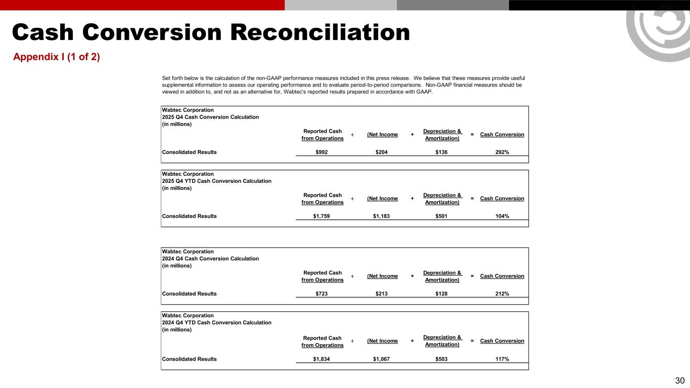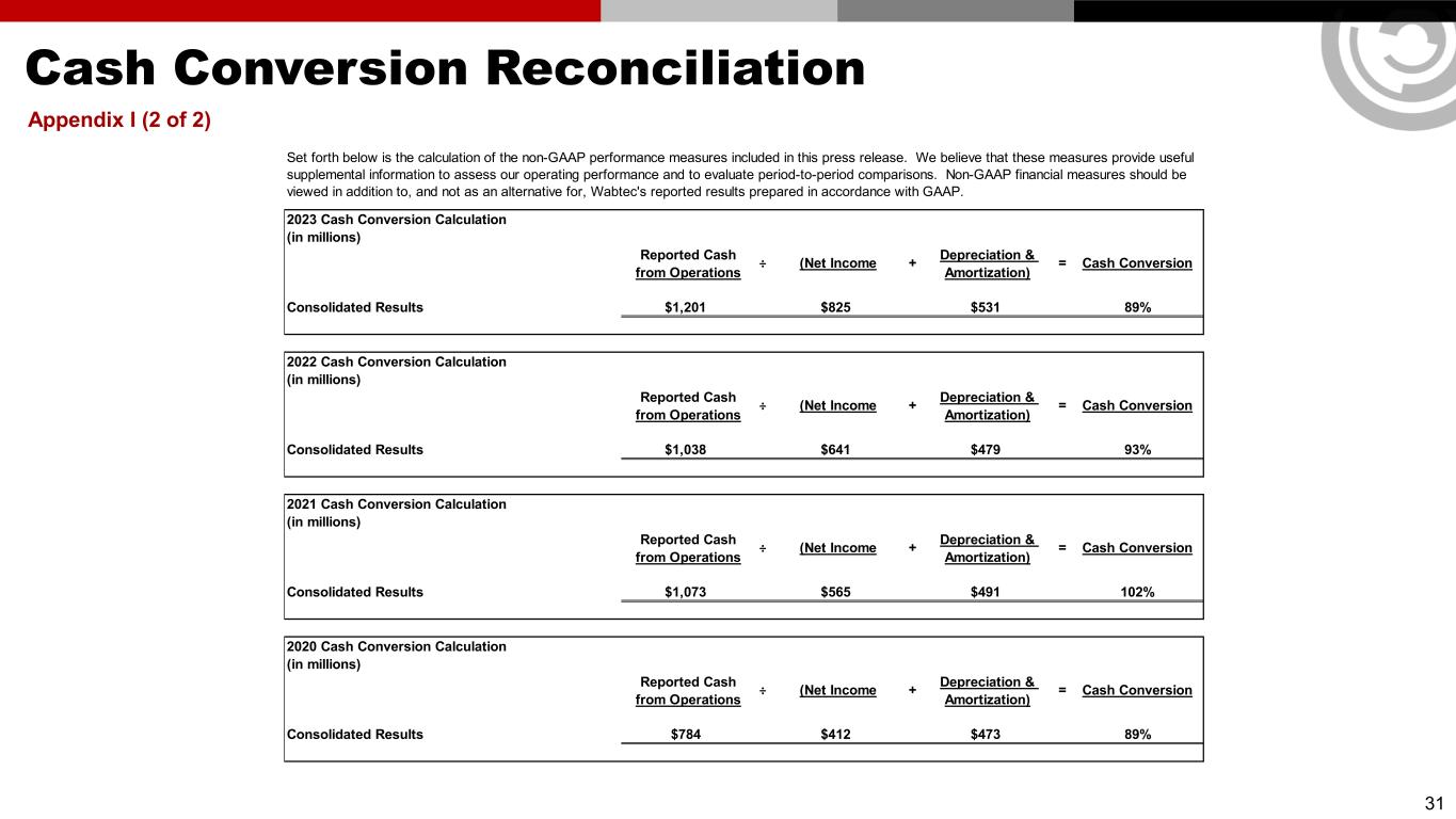 Cash Conversion Reconciliation Appendix I (1 of 2) 30 Wabtec Corporation 2025 Q4 Cash Conversion Calculation (in millions) Reported Cash from Operations Consolidated Results $992 $204 $136 292% Wabtec Corporation 2025 Q4 YTD Cash Conversion Calculation (in millions) Reported Cash from Operations Consolidated Results $1,759 $1,183 $501 104% Wabtec Corporation 2024 Q4 Cash Conversion Calculation (in millions) Reported Cash from Operations Consolidated Results $723 $213 $128 212% Wabtec Corporation 2024 Q4 YTD Cash Conversion Calculation (in millions) Reported Cash from Operations Consolidated Results $1,834 $1,067 $503 117% Cash Conversion Set forth below is the calculation of the non-GAAP performance measures included in this press release.  We believe that these measures provide useful supplemental information to assess our operating performance and to evaluate period-to-period comparisons.  Non-GAAP financial measures should be viewed in addition to, and not as an alternative for, Wabtec's reported results prepared in accordance with GAAP. ÷ (Net Income + Depreciation & Amortization) = Cash Conversion ÷ (Net Income + Depreciation & Amortization) = Cash Conversion ÷ (Net Income + Depreciation & Amortization) = Cash Conversion ÷ (Net Income + Depreciation & Amortization) =