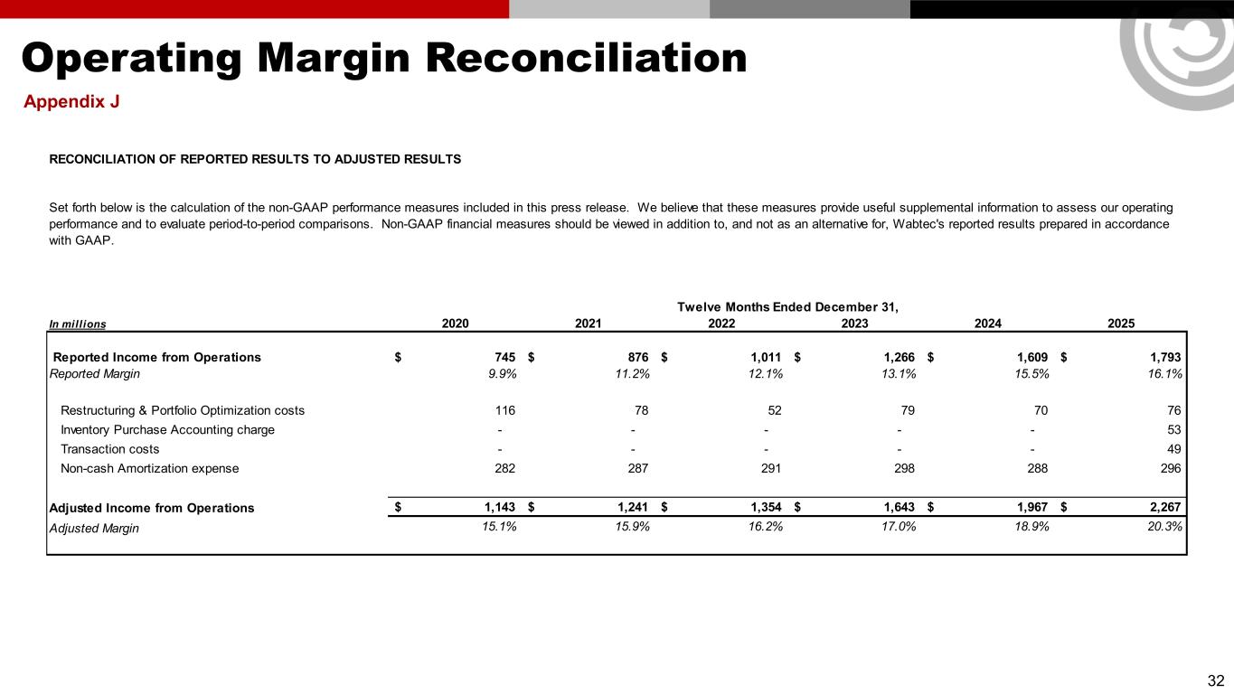 Operating Margin Reconciliation Appendix J 32 In millions 2020 2021 2022 2023 2024 2025 Reported Income from Operations 745$ 876$ 1,011$ 1,266$ 1,609$ 1,793$ Reported Margin 9.9% 11.2% 12.1% 13.1% 15.5% 16.1% Restructuring & Portfolio Optimization costs 116 78 52 79 70 76 Inventory Purchase Accounting charge - - - - - 53 Transaction costs - - - - - 49 Non-cash Amortization expense 282 287 291 298 288 296 Adjusted Income from Operations 1,143$ 1,241$ 1,354$ 1,643$ 1,967$ 2,267$ Adjusted Margin 15.1% 15.9% 16.2% 17.0% 18.9% 20.3% RECONCILIATION OF REPORTED RESULTS TO ADJUSTED RESULTS Twelve Months Ended December 31, Set forth below is the calculation of the non-GAAP performance measures included in this press release.  We believe that these measures provide useful supplemental information to assess our operating performance and to evaluate period-to-period comparisons.  Non-GAAP financial measures should be viewed in addition to, and not as an alternative for, Wabtec's reported results prepared in accordance with GAAP.