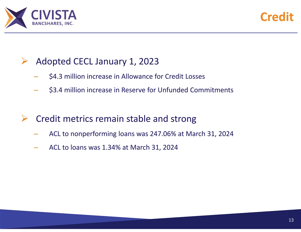 Liquidity Ø Strong on‐balance sheet liquidity – $452 million of cash and unpledged securities at March 31, 2024 Ø Ready access to off‐balance sheet funding – Immediate access to $1.3 billion in funding from FHLB, Federal Reserve and CDARS/IntraFi Ø Civista has not and does not anticipate using the Federal Reserve’s Bank Term Funding program 12