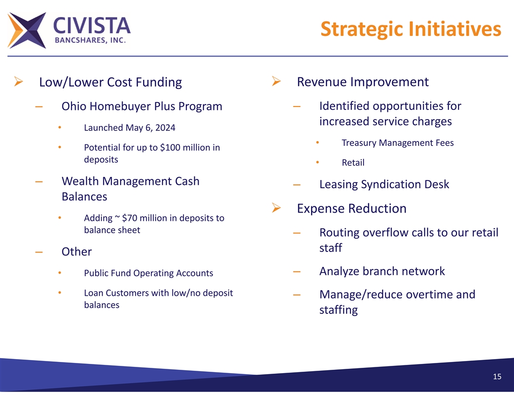 Capital Ø Civista continues to create capital through earnings Ø “Well Capitalized” by regulatory standards Ø Tangible Common Equity ratio was 6.28% at March 31, 2024 14
