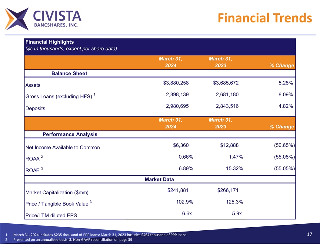 Financial Trends 1 Total Deposits ($ in millions) $2,985 $2,981 $2,620 $2,417 $2,189 $1,679 2019 2020 2021 2022 2023 2024 Q1 24 1. 2022 includes the addition of $271 million in deposits due to the Comunibanc Corp acquisition.