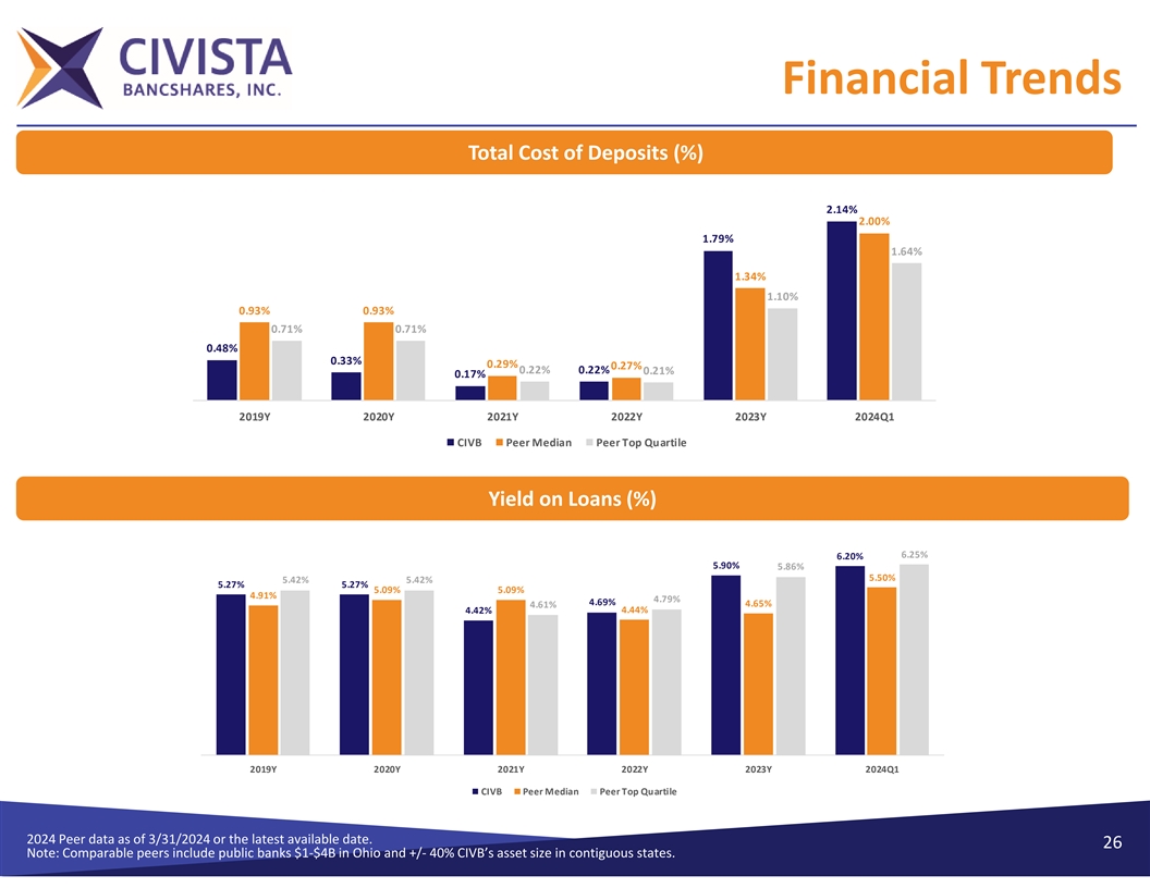Financial Trends Deposit Mix Ø Total Deposits: $3.0 billion Ø Loan/Deposit Ratio: 98.3% Cost of Cost of Year Deposits Funding 2019 0.48% 0.68% 2020 0.33% 0.43% 2021 0.17% 0.24% 2022 0.15% 0.39% 2023 1.19% 1.72% 2024 2.14% 2.54% 25